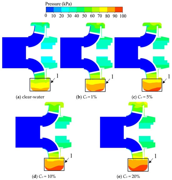 Figure 26 shows the pressure distribution in the volute mid-section of the sewage pump under the clear-water condition and under solid-phase volume fractions (Cv) of 1%, 5%, 10%, and 20% at a flow rate of 1.0Qd. As illustrated in the figure, the overall pressure distribution trend within the volute flow passage is similar under both clear-water and solid–liquid two-phase flow conditions. However, with increasing particle volume fraction, the pressure within the flow passage exhibits a gradual upward trend. This variation is primarily attributed to the increase in the effective density of the solid–liquid mixture and the intensified inter-particle collisions. As the particle volume fraction increases, the frequent collisions among particles and the interphase drag significantly enhance the flow resistance. Physically, the fluid transfers more pressure energy to the particles to overcome the inertia of the dense solid phase. Consequently, the static pressure distribution is readjusted to balance the increased momentum exchange, resulting in a gradual increase in the overall pressure level.