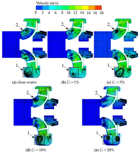 Figure 24. Velocity distribution in the radial mid-section of the sewage pump under clear-water and different solid-phase volume fraction conditions. The black lines with arrowheads represent the flow streamlines.