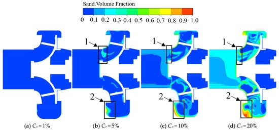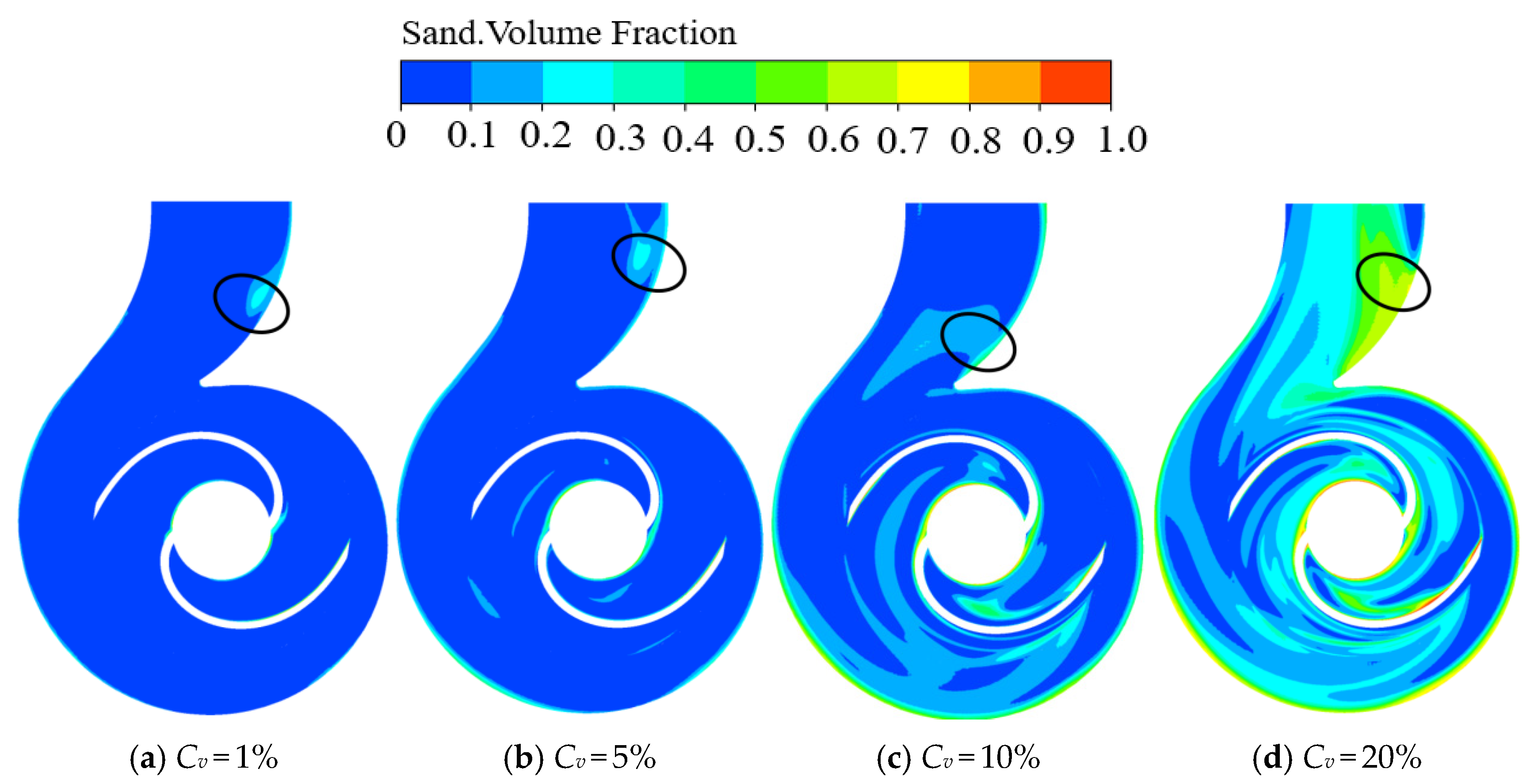 Figure 25. Solid-phase distribution in the radial mid-section of the sewage pump under different solid-phase volume fraction conditions.