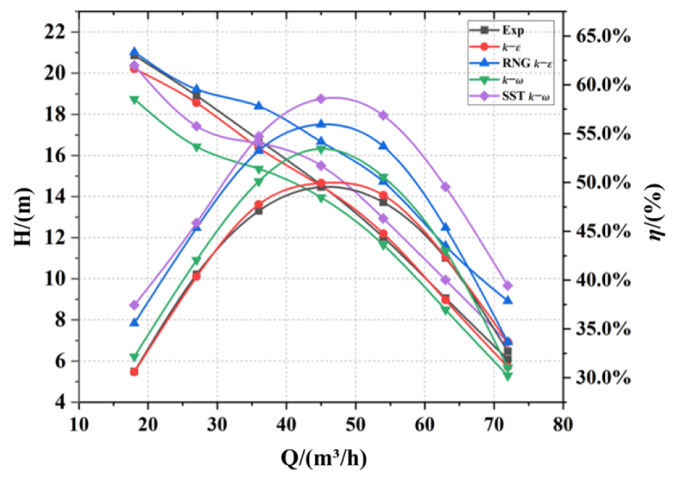 In this study, numerical simulations were conducted using ANSYS-CFX 19.2 software. The selection of a turbulence model has a significant impact on computational results. To identify the most suitable turbulence model for this research, four turbulence models (standard k-ε, RNG k-ε, k-ω, and SST k-ω) were employed for numerical simulations, and the simulation results were compared with experimental data. Figure 5 presents a comparison between the external characteristic simulation results of the sewage pump and the experimental results. As shown in the figure, the overall trends of the external characteristic simulation results from all turbulence models are consistent; however, the simulation results from the standard k-ε model are the closest to the experimental results, while the deviations of other models are relatively larger. Therefore, the standard k-ε model was selected as the turbulence model for the numerical simulations in this study.