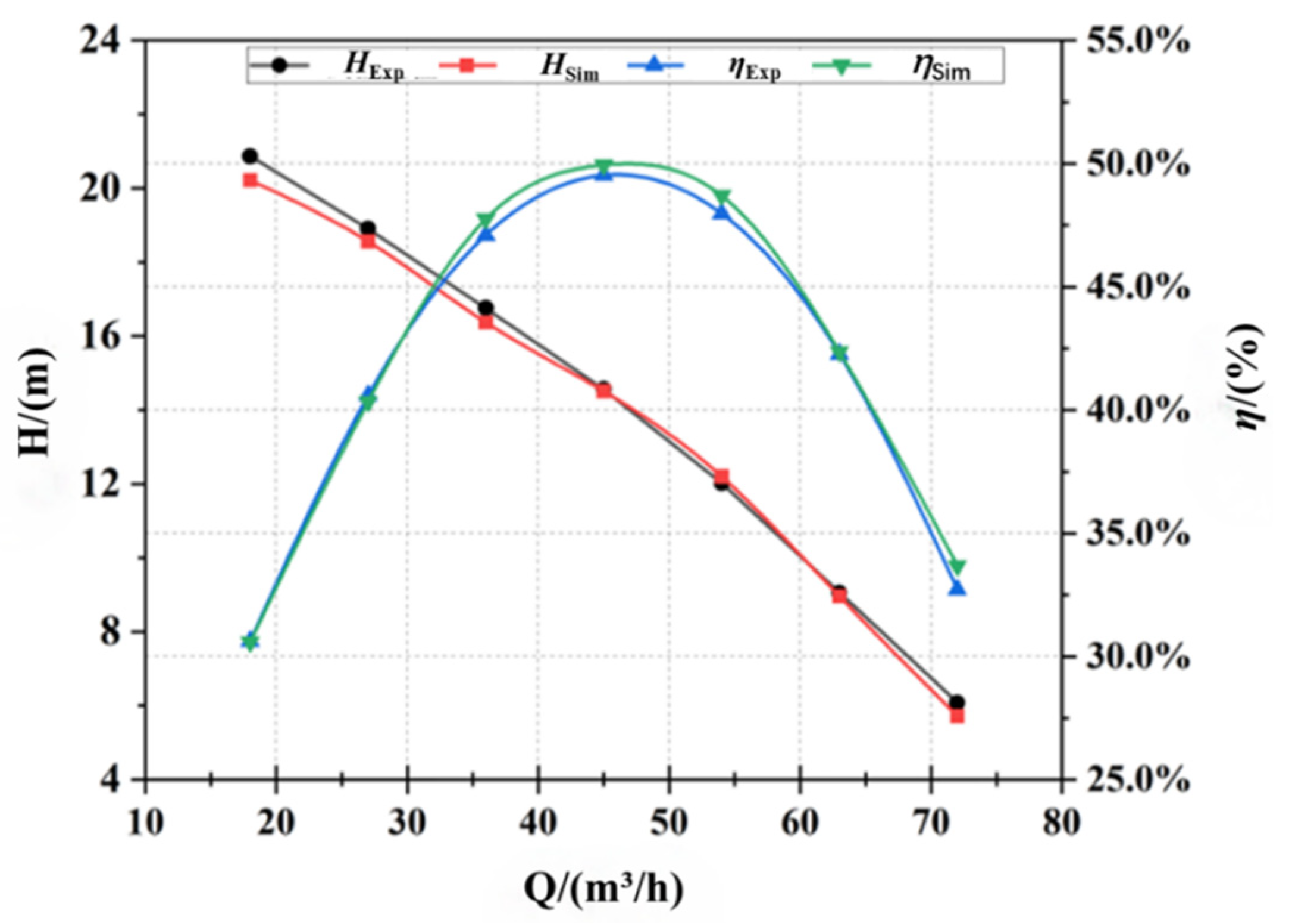 Figure 8 compares the simulation results with experimental data at different flow rates. It is evident that the simulation curves for head and efficiency closely match the experimental measurements across the entire operating range. At the rated flow condition, the head error is only 0.41%. More importantly, the model shows excellent consistency for both head and efficiency across all operating conditions, not just at the rated point. The average relative errors for head and efficiency are 3.2% and 4.1%, respectively. The maximum deviation is 4.8%, observed at the minimum flow condition (0.6Qd), with all errors remaining within 5%. This confirms that the numerical model developed in this study demonstrates high accuracy and reliability across the entire flow range, not just at the design point. A comparison with the design structure of ordinary centrifugal pumps shows that the sewage pump selected in this paper is equipped with a fixed knife device at the impeller inlet. This structure alters the initial flow state of the fluid entering the impeller, making the flow pattern in the impeller inlet region more complex. The presence of the fixed knife may intensify fluid separation, leading to an increase in local vortex intensity, and this disturbance propagates to subsequent flow channels along with fluid movement. In numerical simulation, this may be one of the reasons for the slight differences between the simulated head, efficiency and the measured data. However, in the numerical simulation of the full flow condition, the variation in external characteristics shows that the simulation results tend to be consistent with the experimental data. The consistent variation trend under the full flow condition further fully confirms the applicability and accuracy of the numerical simulation.