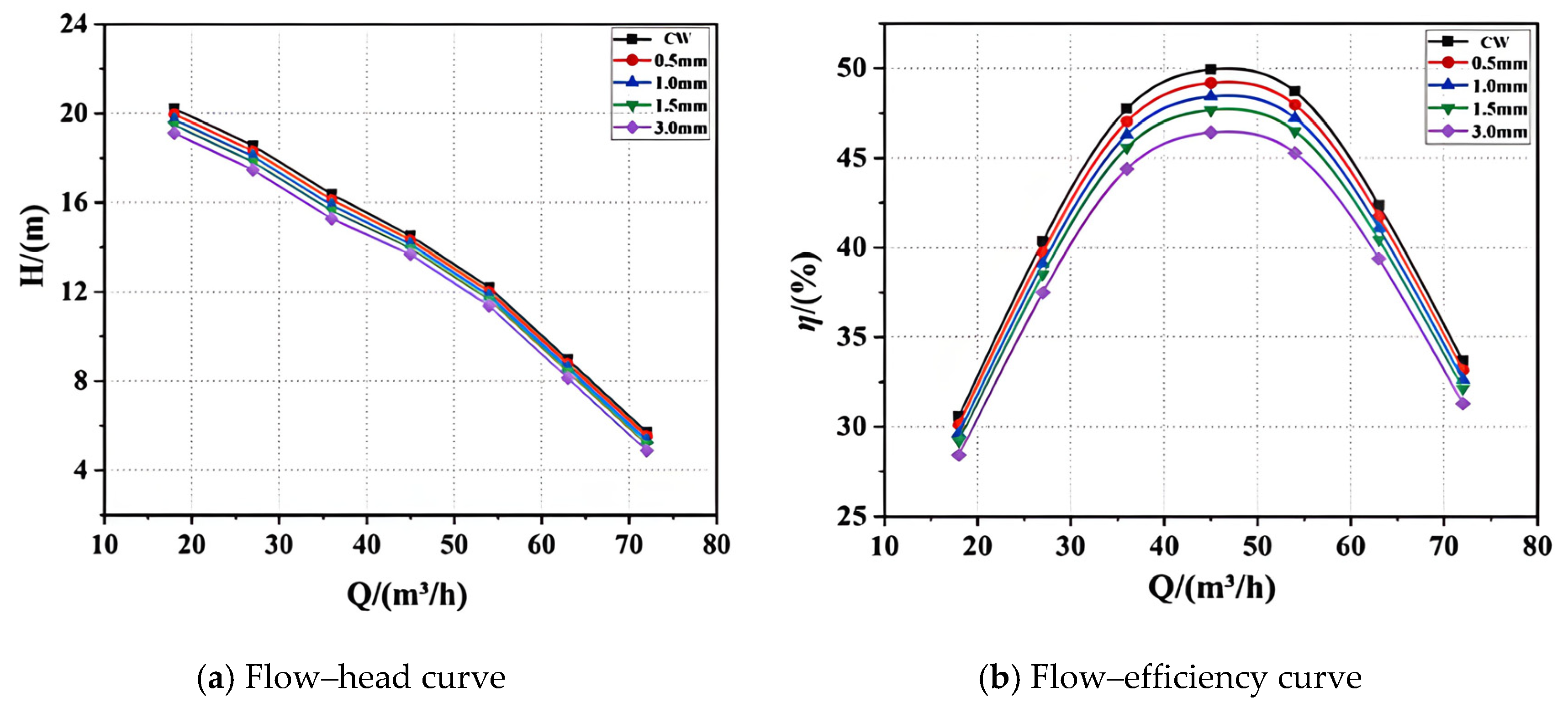 For different particle sizes, simulations were performed to evaluate sewage pump external characteristics. Figure 9a,b show head-flow and efficiency-flow relations. Results indicate that with constant particle size, head decreases with increasing flow, while efficiency rises to a peak at rated flow and then declines. After adding particles, overall trends remain similar to clear-water conditions, but at the same flow both head and efficiency decrease as particle size increases. This occurs because larger particles increase the impact between the fluid and the impeller, requiring more work and reducing performance. At rated flow, particle diameters of 0.5, 1.0, 1.5, and 3.0 mm result in head reductions of 1.26%, 2.51%, 3.77%, and 5.66%, respectively, along with efficiency reductions of 0.75%, 1.50%, 2.26%, and 3.51%. Therefore, larger particles cause greater resistance and lead to more significant performance losses.