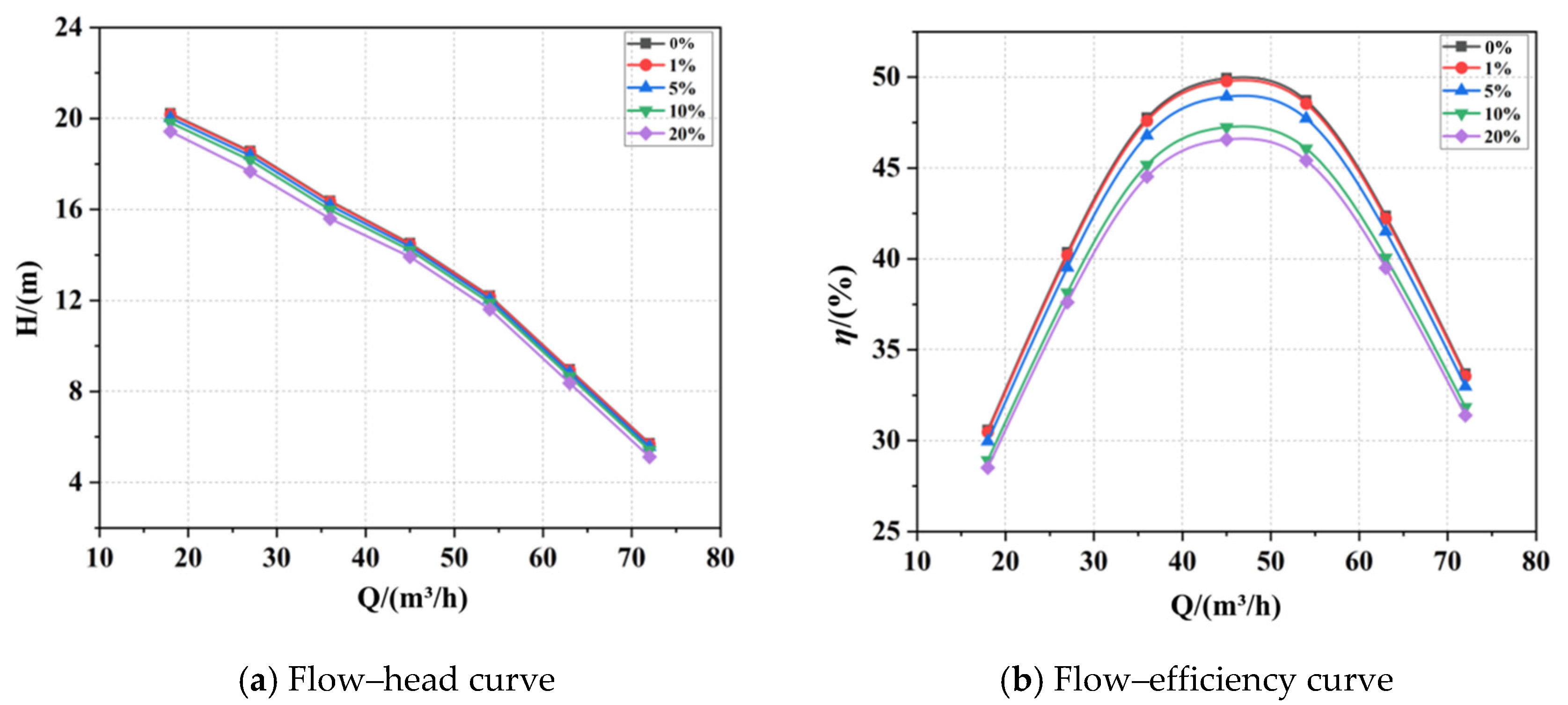 For different solid-phase volume fractions, simulations were conducted to analyze external characteristics of the sewage pump. Figure 10a,b show the head-flow and efficiency-flow relations. Results indicate that at constant volume fraction, head decreases with flow rate, while efficiency exhibits a typical peak consistent with clear-water conditions. At rated flow, both head and efficiency decrease with increasing volume fraction, following the same trend as in clear water. This occurs because added solid particles increase mixture viscosity, raising impeller energy consumption and reducing performance. Compared with clear water, when solid-phase volume fractions are 1%, 5%, 10%, and 20%, head decreases by 0.20%, 1.02%, 2.08%, and 4.17%, and efficiency by 0.17%, 1.01%, 2.70%, and 3.37%, respectively. Higher volume fractions thus intensify viscous resistance and cause more pronounced declines in head and efficiency.