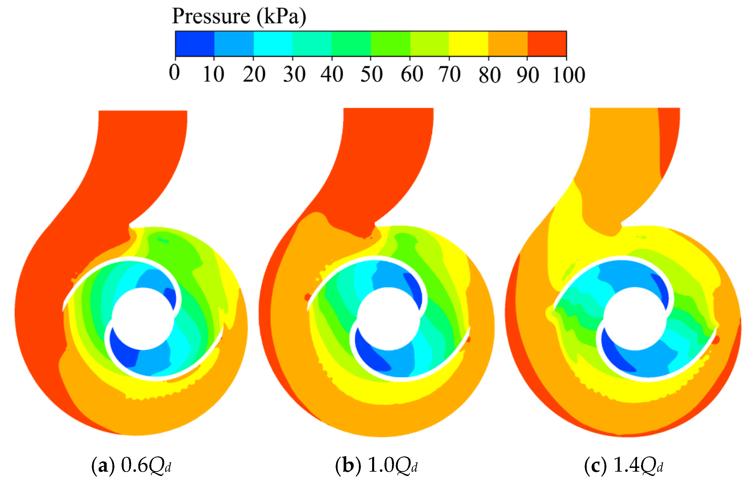 Figure 14. Pressure distribution in the volute mid-section under different flow conditions.