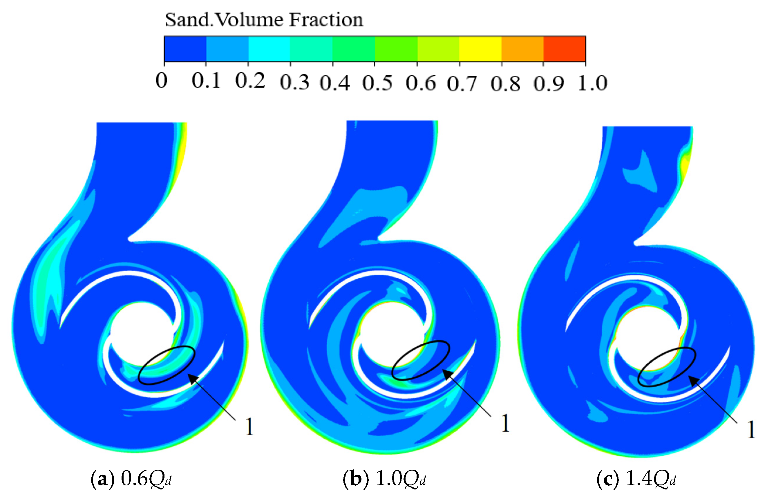 Figure 13 illustrates the solid-phase distribution in the radial mid-section of the sewage pump under flow conditions of 0.6Qd, 1.0Qd, and 1.4Qd. As depicted in the figure, solid particles predominantly accumulate within the flow channels of both the impeller and volute. Under low-flow conditions, the solid phase receives less kinetic energy, resulting in a relatively concentrated and uneven distribution, particularly in the volute (Zone 1). This is due to the insufficient kinetic energy imparted to the particles, which hinders their ability to overcome local resistance, causing them to accumulate in regions of lower flow velocity. As the flow rate increases, the solid particles acquire more kinetic energy, enabling them to overcome local resistance more effectively. Consequently, the distribution of the solid phase becomes progressively more uniform, with particles spreading toward the periphery of the flow channels, both in the impeller and volute. This behavior is governed by a complex interaction between fluid dynamics and particle inertia. As the flow rate increases, the solid particles gain sufficient energy to mix more thoroughly with the liquid phase, leading to a more homogeneous particle distribution. However, due to their larger inertia, larger particles continue to lag behind the main flow direction, resulting in a higher concentration of particles in certain localized regions, particularly in areas with lower flow velocities, such as the volute.