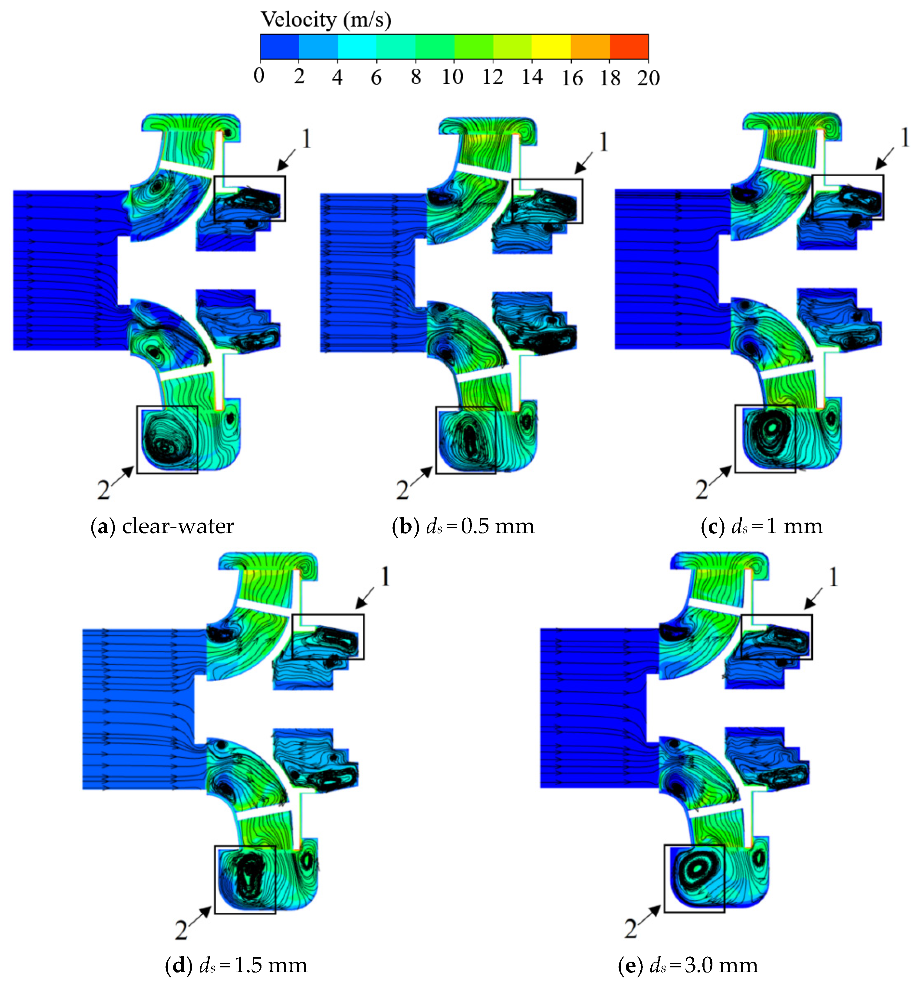Figure 18 presents the velocity contour plots of the radial mid-section of the sewage pump under a 1.0Qd flow rate for both the clear water condition and conditions with particle diameters (ds) of 0.5 mm, 1.0 mm, 1.5 mm, and 3.0 mm. As shown in the figure, backflow is observed to varying degrees in both the impeller and pump cavity regions (Zone 1, Zone 2). Clear flow separation and stall wake zones are evident at the impeller inlet and within the volute channel, suggesting that these regions experience significant dynamic-static interference. Moreover, more pronounced backflow is observed in the rear cavity region, indicating that additional hydraulic losses occur here.