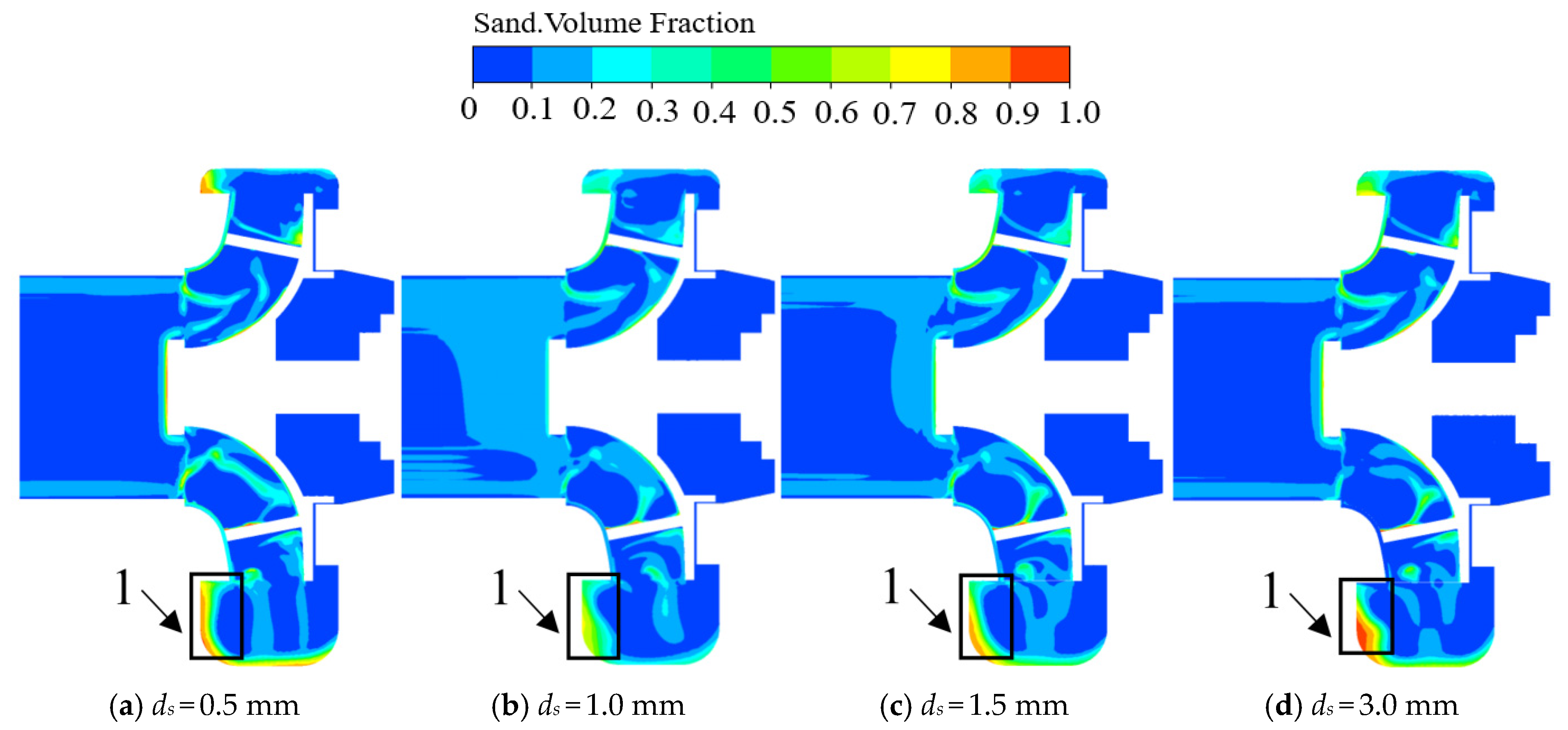 Figure 22 illustrates the solid-phase distribution in the volute mid-section of the sewage pump under the clear-water condition and under particle diameter (ds) conditions of 0.5 mm, 1.0 mm, 1.5 mm, and 3.0 mm at a flow rate of 1.0Qd. It can be observed that solid particles are primarily concentrated within the impeller flow passages, whereas in the volute they are predominantly deposited along the inner wall. As the particle diameter increases, the high-concentration particle region in Zone 1 becomes increasingly prominent. This trend implies that coarser particles, possessing higher inertia, are less responsive to the fluid drag force. Consequently, they are more strongly subjected to centrifugal separation and tend to accumulate along the wall. Moreover, the particle volume fraction in the vicinity of the volute tongue near the outlet shows a noticeable increase. This local accumulation is largely attributed to the direct impingement of high-inertia particles on the tongue structure, as they fail to follow the sharp curvature of the streamlines in this region.