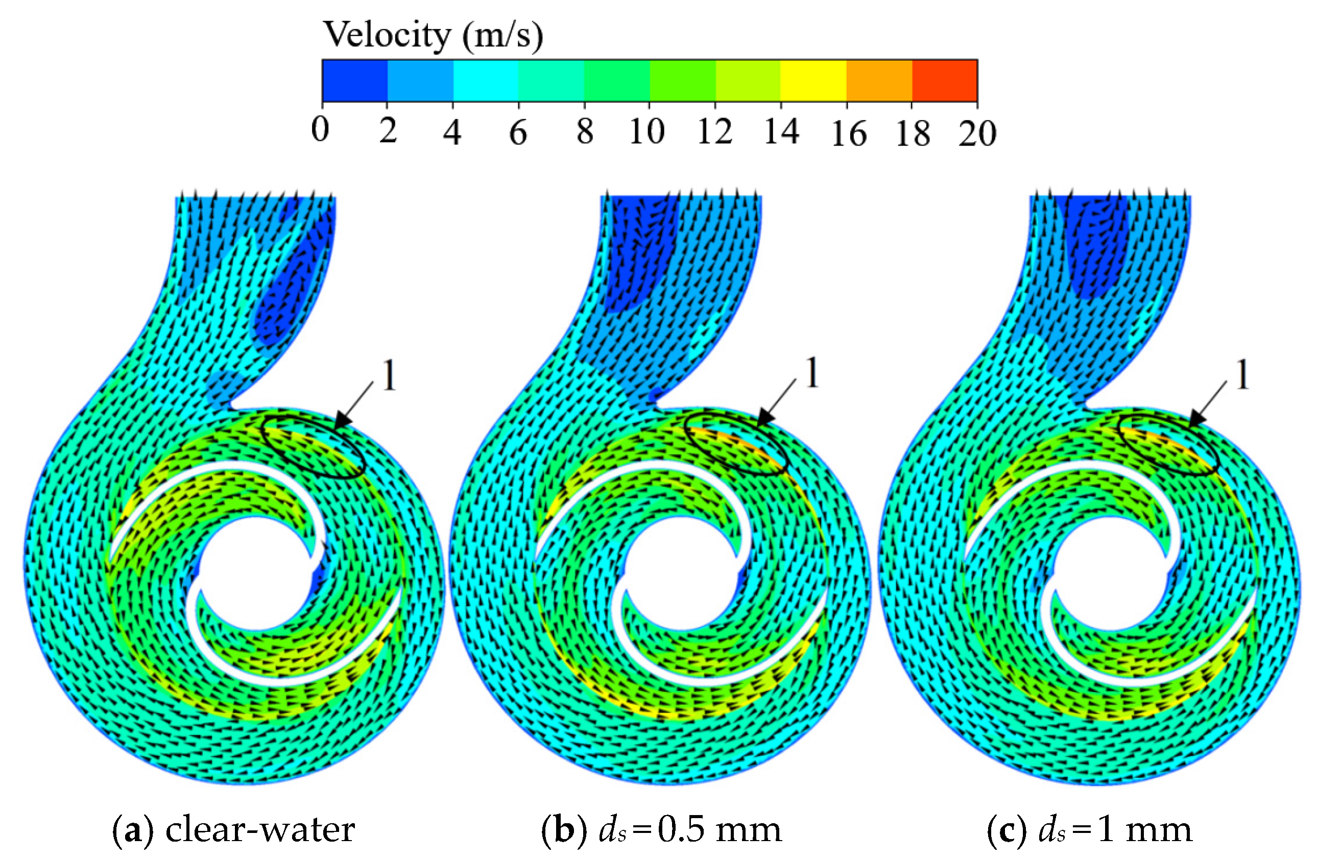 Figure 21. Velocity plots of the volute mid-section under clear-water and different particle size conditions. The black arrowheads represent the velocity vectors.