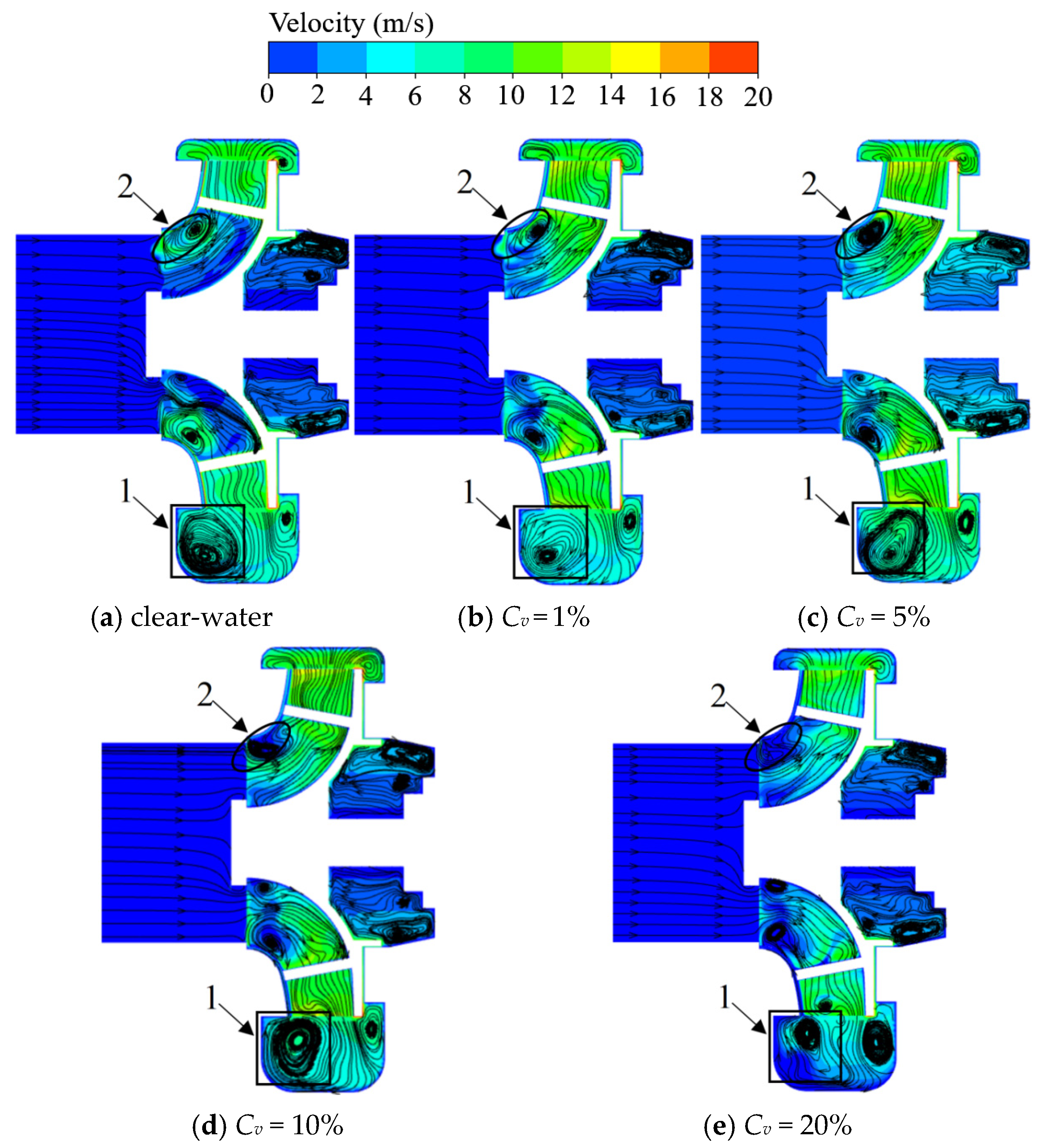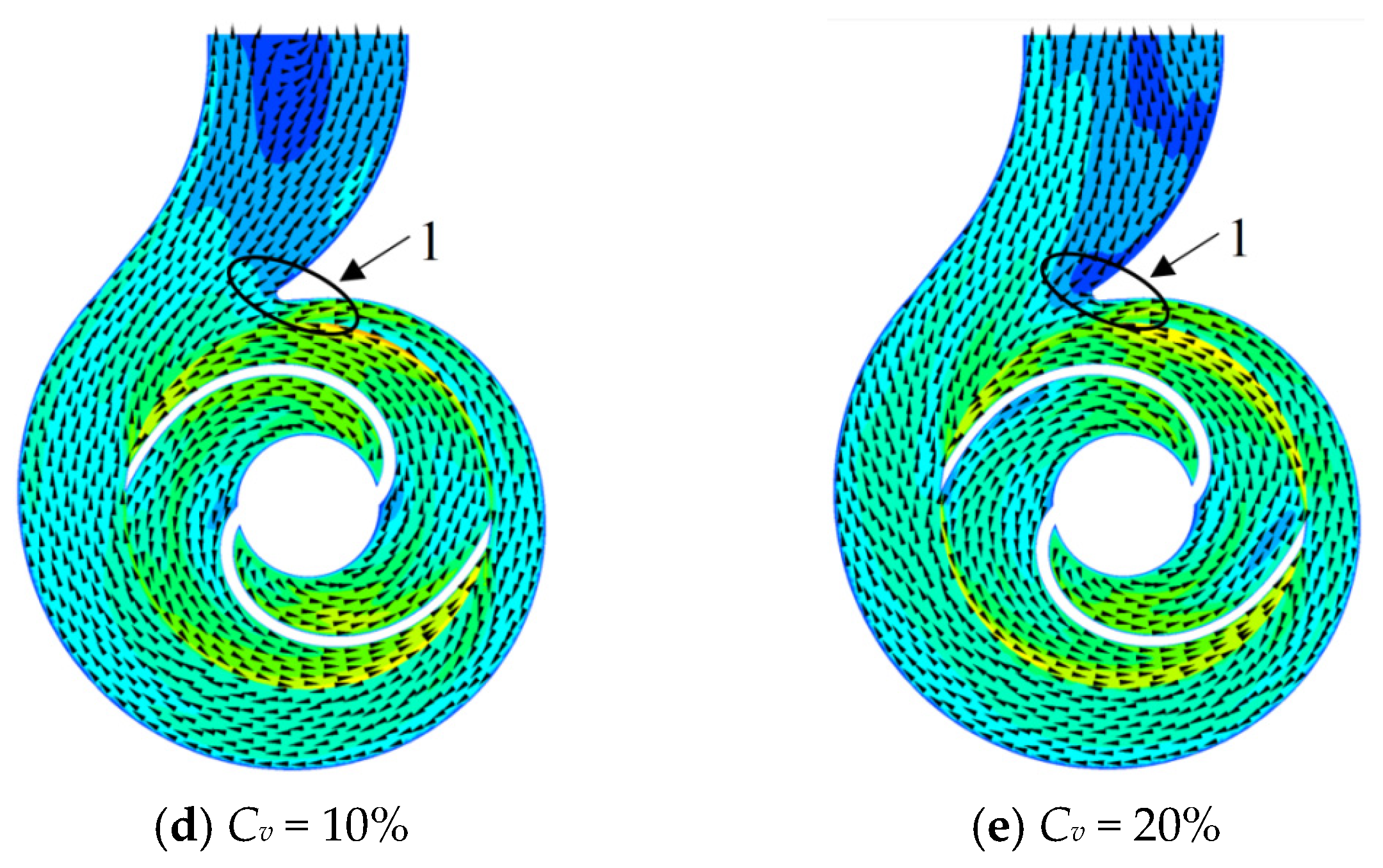Figure 24 shows the velocity contour plots of the radial mid-section of the sewage pump under the clear-water condition and under solid-phase volume fractions (Cv) of 1%, 5%, 10%, and 20% at a flow rate of 1.0Qd. As illustrated in the figure, backflow phenomena of varying degrees occur in the impeller inlet, volute flow passage, and rear cavity regions. Among these, the volute flow passage exhibits the most pronounced backflow, influenced by the high-velocity flow at the impeller outlet, with a relatively large vortex region (Zone 1) being generated. As shown in Figure 24b–e, the increase in solid-phase volume fraction leads to a rise in the viscosity of the fluid medium, a reduction in the efficiency of mechanical energy conversion by the impeller, and an intensification of dynamic-static interference effects. Physically, the high concentration of particles consumes a significant amount of fluid kinetic energy through drag work. This momentum loss makes the fluid more susceptible to flow separation, thereby enlarging the vortex regions. Notably, under low-concentration conditions (1% and 5%), the overall velocity gradient distribution is relatively smooth; however, in the impeller shroud region (Zone 2), a greater degree of backflow is observed.