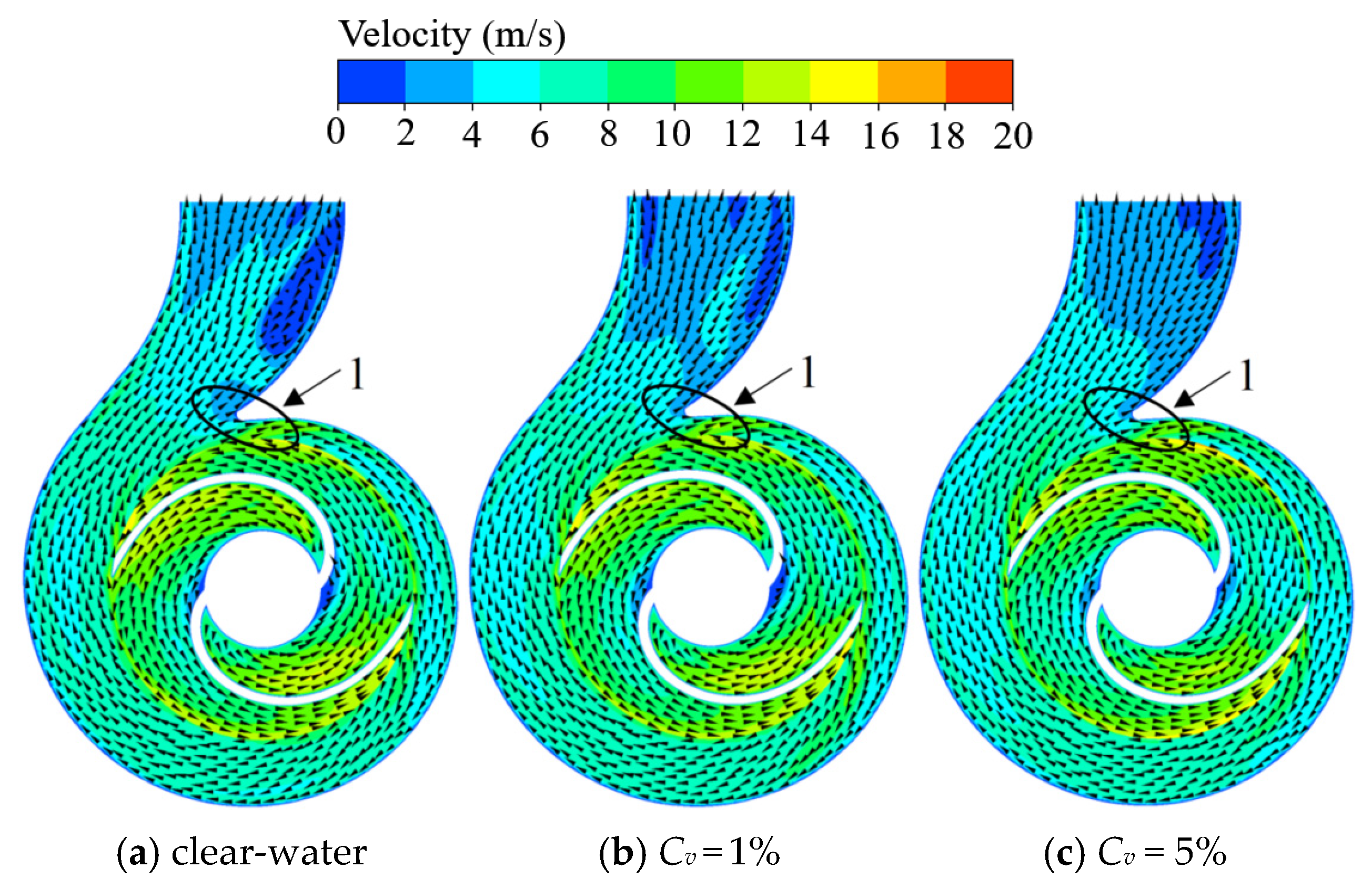 Figure 27. Velocity distribution in the volute mid-section under clear-water and different solid-phase volume fraction conditions. The black arrowheads represent the velocity vectors.