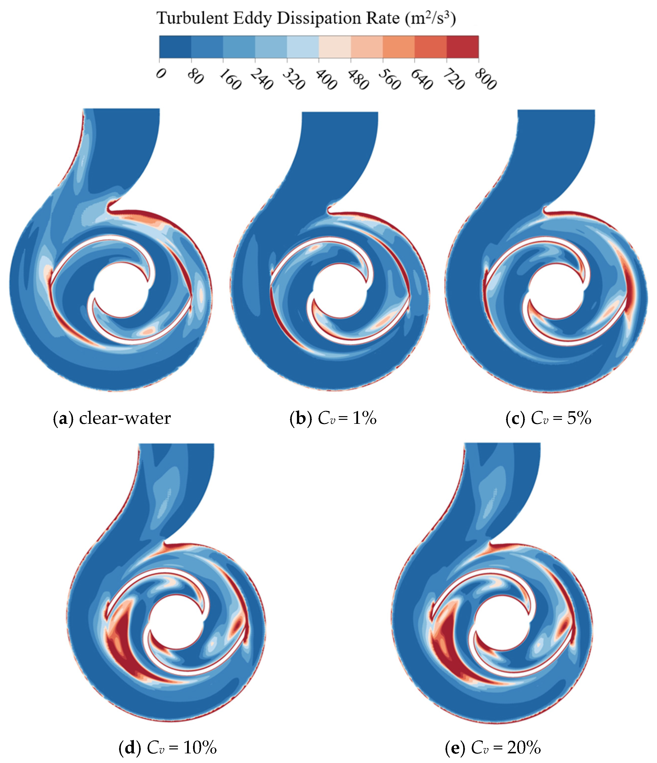 Figure 30 presents the distribution of the Turbulent Eddy Dissipation Rate in the volute under clear water and different solid concentrations. This indicator intuitively reflects the rate of fluid energy loss. By observing the contours, it is evident that under clear water and low-concentration conditions (1% and 5%), the red regions representing high energy consumption are relatively small and strictly confined to the blade trailing edges and the tip of the volute tongue. However, when the concentration rises to 10% and 20%, the high-dissipation regions near the impeller outlet and the volute tongue expand significantly towards the surroundings, accompanied by a marked increase in numerical values. This phenomenon is primarily attributed to the disturbance effect of particles on the fluid. As the concentration increases, dense particle clusters flowing out of the impeller possess high inertia and cannot pass through the volute tongue as smoothly as the liquid phase. Instead, they frequently impact the walls and agitate the surrounding fluid. Such continuous collisions and intense friction dissipate a substantial amount of kinetic energy, causing energy that should have been converted into pressure to be ineffectively consumed. This directly leads to the degradation of fluid transport efficiency under high-concentration conditions.