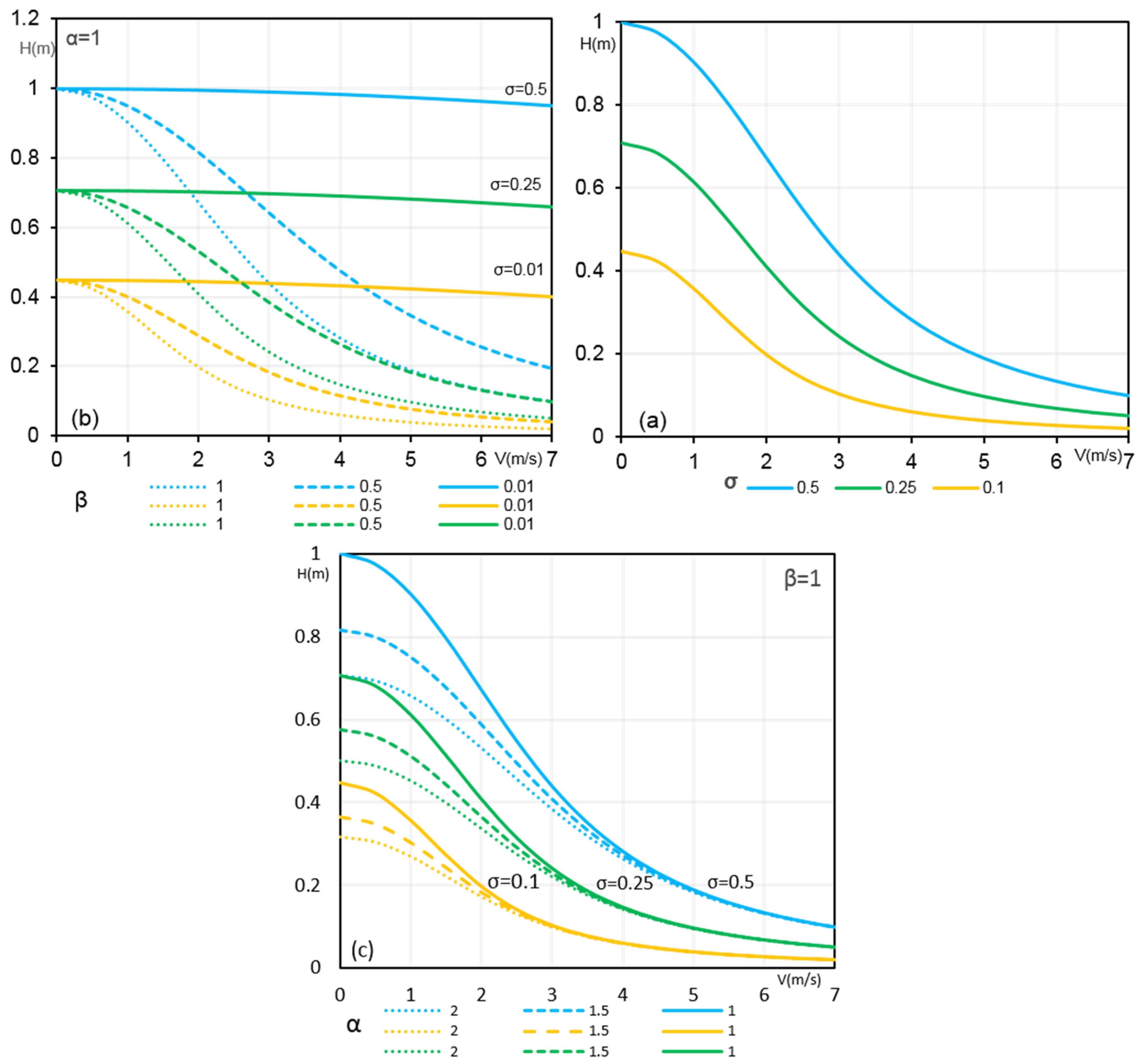 Figure 1c, can contribute to increasing or decreasing the effect of water depth, which impacts the value of sigma in the intercept of the curve. For a higher alpha value, the sigma isolines are translated by a curve of a general lower depth, and vice versa. For lower values, alpha can adjust the vertical pressure applied to an object, which involves the water column effect with regard to the weight of the object. We are therefore referring to buoyancy. In other words, these two coefficients (α and β) can increase or decrease the sensitivity of the hydrodynamic and hydrostatic action of the water on the submerged object. These parameters can be related to the shape characteristics of the object. For a resistant object, the parameter σ is less sensitive to the velocity, and for a less resistant object, the force is more sensitive to the hydrodynamic action or velocity.