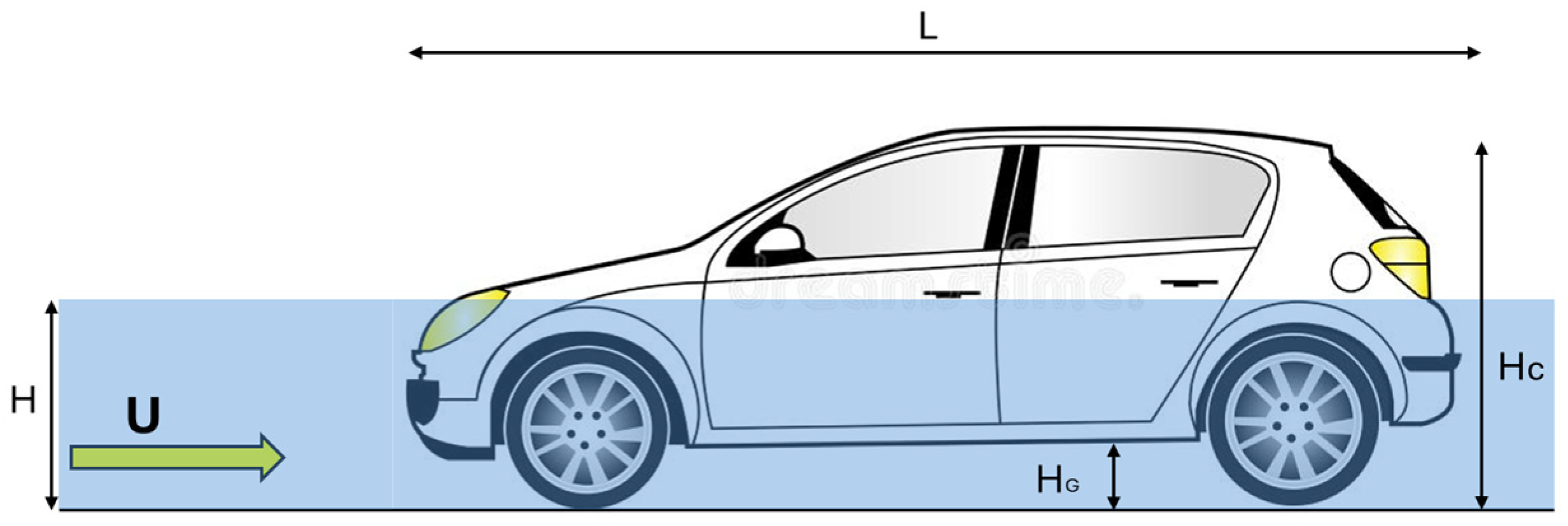 is equal to 1, which involves the relative density between the vehicle and the water flow. This is valid when the submerged volume of the car is small and the water depth is shallow. In the opposite case, watertightness of the vehicles must be taken into account [