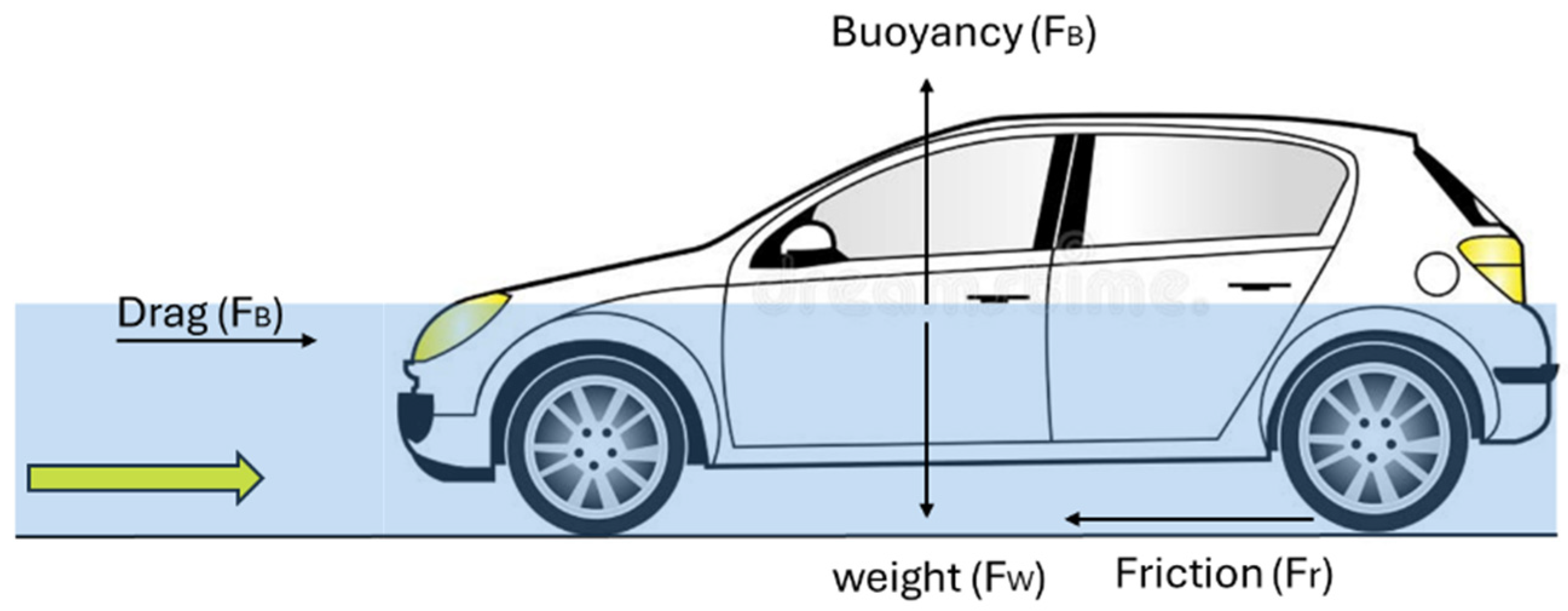 When a vehicle is parked on a flooded road, it is subjected to several forces: lift, drag, buoyancy, friction, and gravity. It is assumed that the wheels of a vehicle are all locked against any movement as it parks on a road; thus, a frictional force will be produced to resist the vehicle from sliding on the road surface.