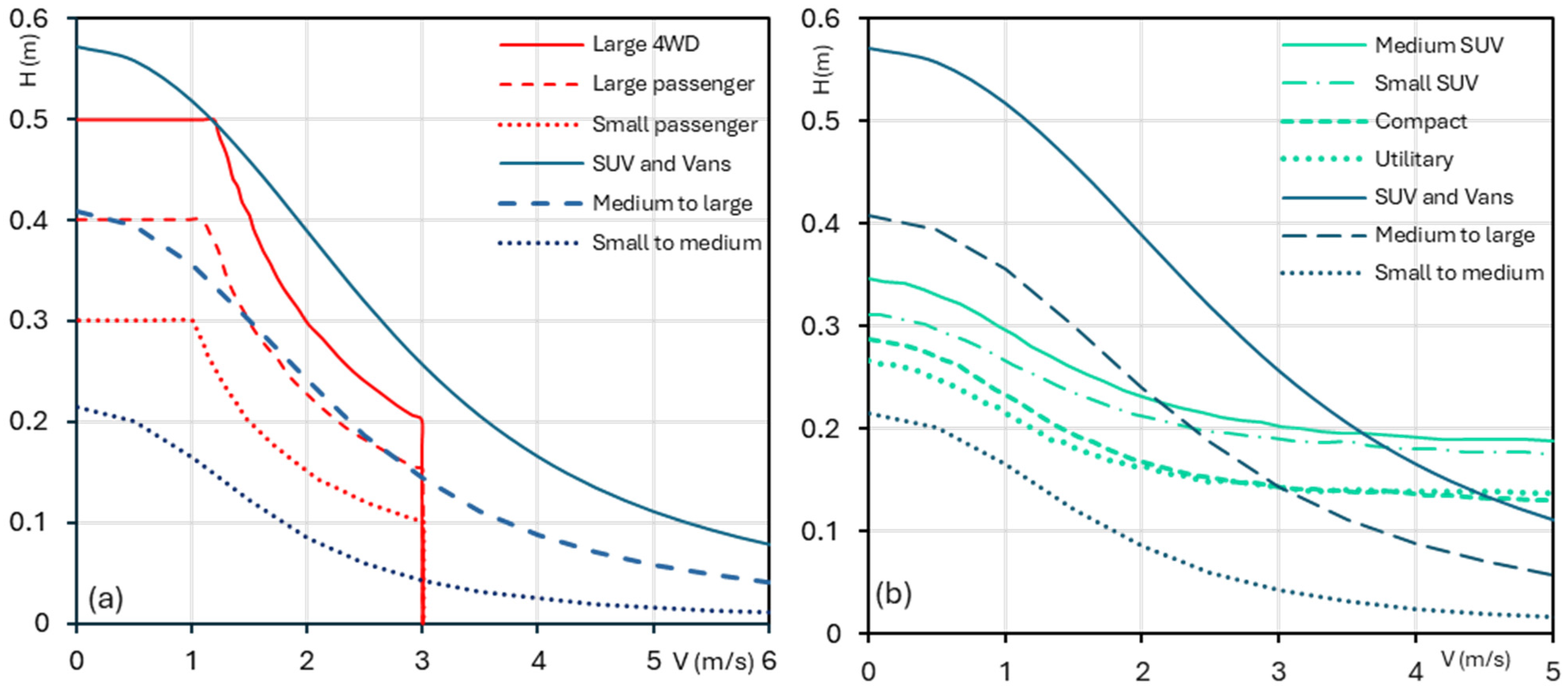27] introduced a draft of a stability threshold for static vehicles by classifying cars into small passenger, large 4WD, and large passenger according to their physical characteristics. Buoyancy limits were defined at 0.5 m of maximum depth for large 4WD vehicles; for large passenger vehicles, 0.4 m; and for small passenger vehicles, 0.3 m depth. On the other hand, 3.0 m/s was the maximum velocity for all vehicles. Afterward, Ref. [
