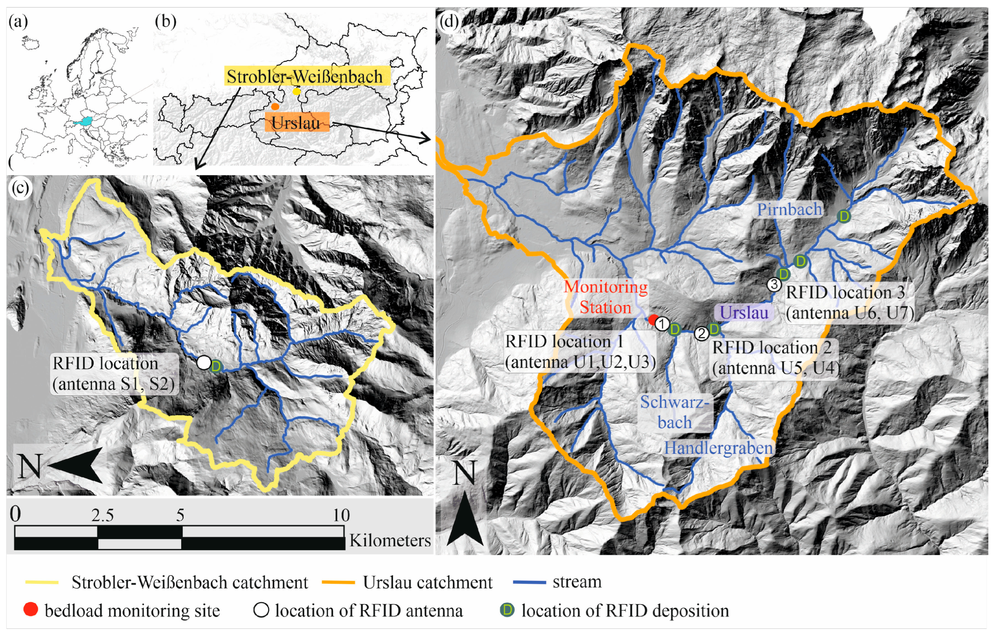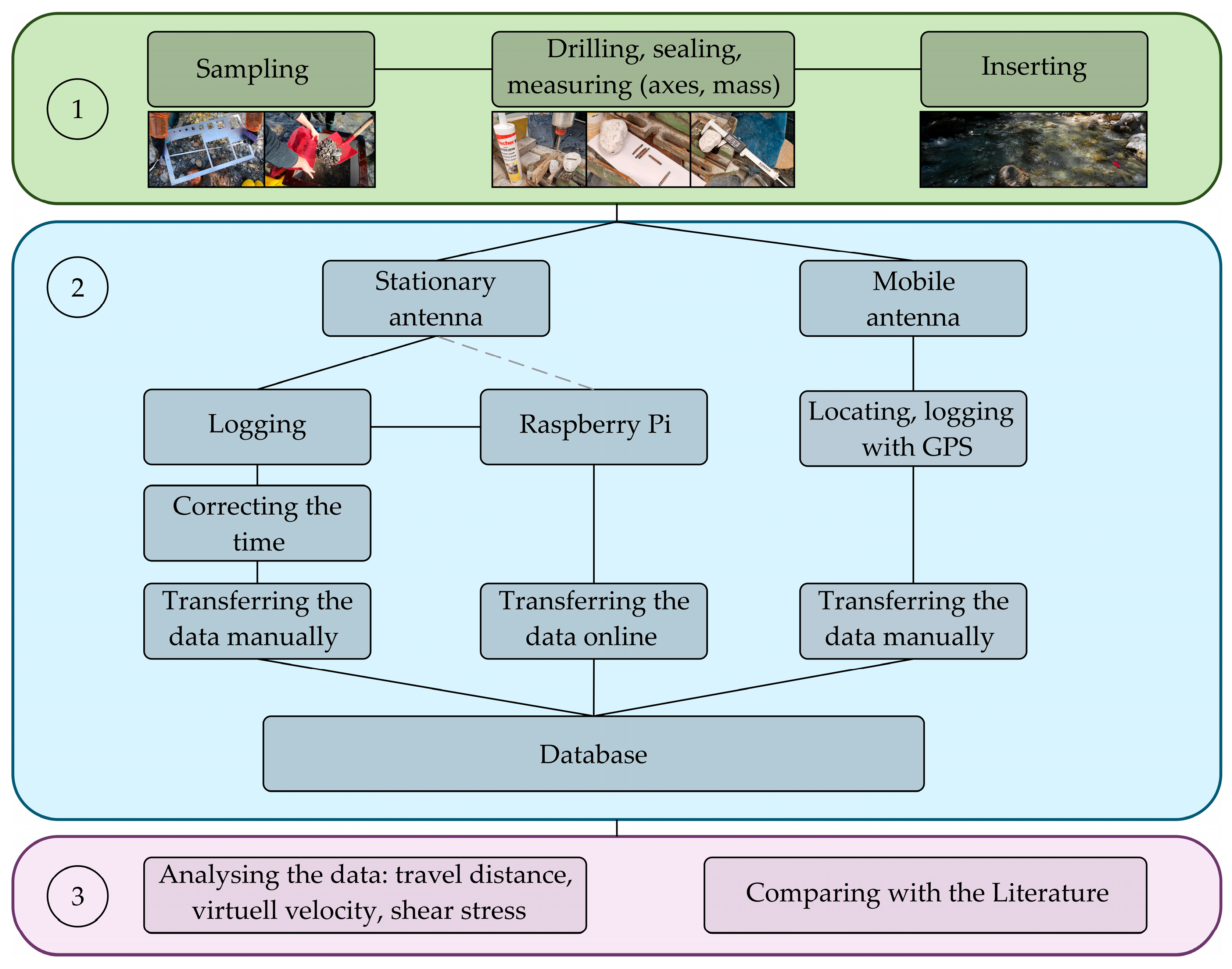 This study aims to detail the applied methodology, demonstrate its analytical capabilities, and present initial results on selective transport processes and particle velocities. It contributes to advancing the instrument-based monitoring of bedload transport in stream systems by using stationary antennas and 1612 RFID-tagged stones. The first key aspect of this study is the development and installation of a permanent tracer monitoring system in alpine streams (i). To achieve this, stationary antennas were increasingly used to reduce the need for complex mobile searches, as suggested by Mao et al. [
