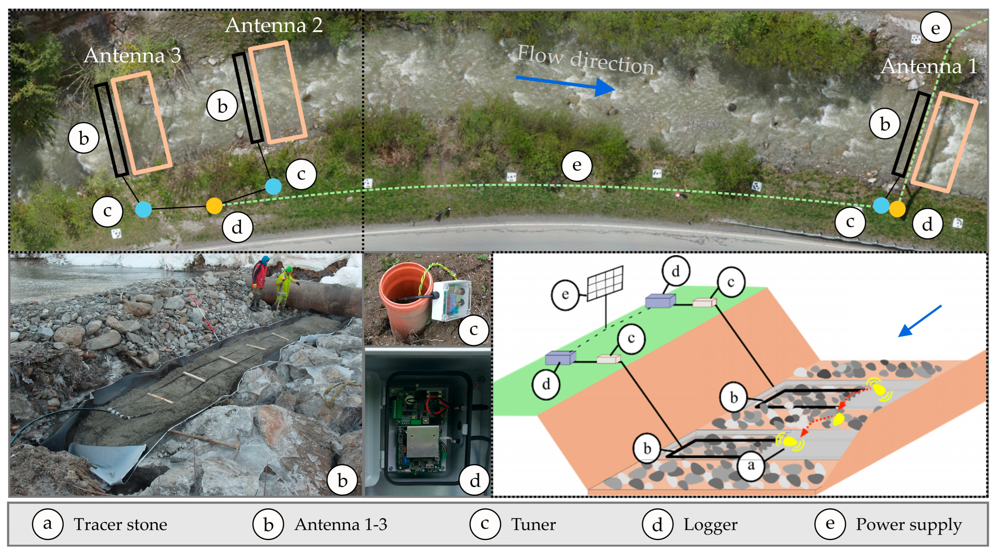 Figure 4 (bottom right), a minimum of two antennas were consistently installed in the field. The configuration of the field setup includes the following elements: (b) an antenna wire that is installed in the form of a loop in the riverbed and encased in concrete, (c) a tuner box that operates and calibrates the antenna, (d) a reader that records the dedicated tracer stones and controls the antenna, and (e) a power supply that is either solar (in orange) or grid-powered (green dotted line). All antennas were encased in concrete with a minimum coverage of 20 cm to protect them from abrasion and ensure sufficient range to detect the RFID tags. Steel was deliberately avoided to prevent interference (reduction in read range). A layer of stone (bedding) was always placed downstream of the antenna to stabilise the profile and prevent deformation in the area of the antenna (