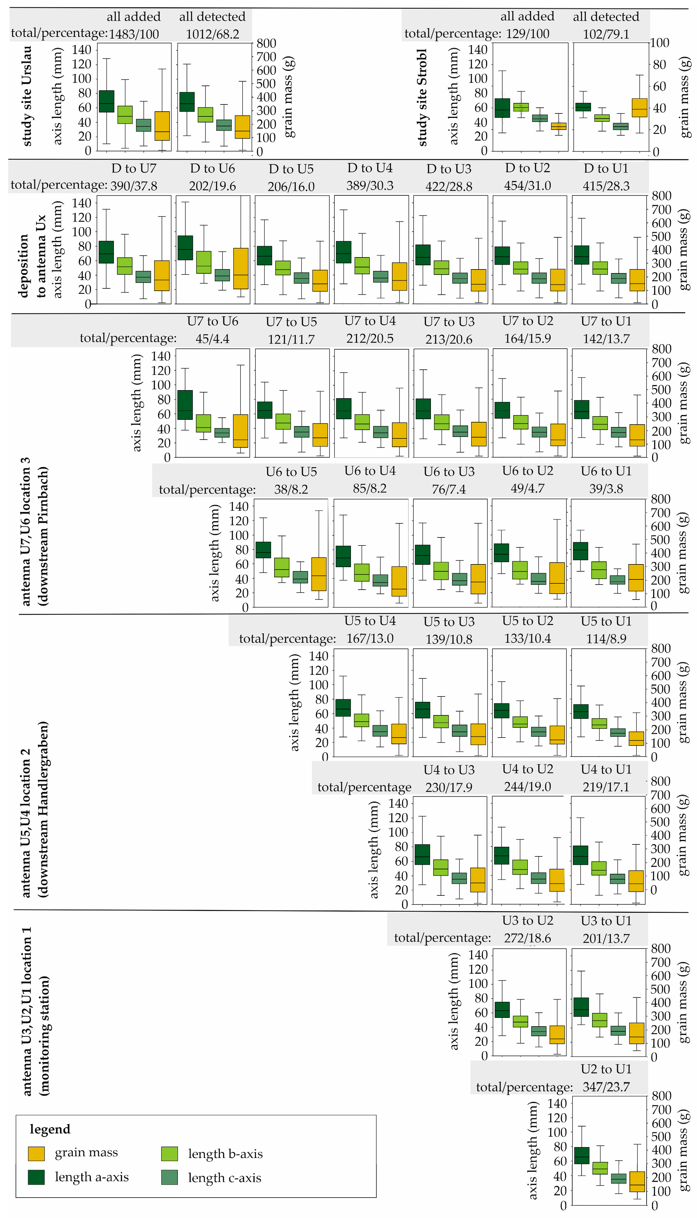 Figure 5 provides a comprehensive visualisation of the geometric parameters (a-, b-, c-axes) and the mass of all deposited and detected stones for this research, categorised by the study site and detection location along the stream. The figure is organised into multiple rows: The first row presents boxplots showing the geometric parameters and the mass of all deposited and detected stones for the Urslau and Strobl study sites. The Urslau grain sizes show significant variability, whereas smaller fractions were deliberately introduced in the Strobler-Weißenbach since the main focus here was on determining the velocity of smaller grain fractions. The second row presents the same parameters for deposited stones, grouped from the deposition point to the detecting antenna. In the figure, the antennas are ordered from left to right in the downstream direction, providing insights into the spatial distribution of detections. The total number of stones and percentage of the overall sample are displayed above the boxplots, demonstrating the detection efficiency of each antenna. For instance, 454 stones were detected at antenna U2, accounting for 31% of those introduced upstream of this antenna. The third, fourth, and fifth rows focus on the geometric parameters of stones detected at two antennas (double detections). The data are sorted from upstream to downstream and are grouped by the three antenna sites. Since double detections require stones to be recorded at two antennas, there are fewer double detections than total detections from release points to a single antenna. In summary, the results furnish a thorough synopsis of nine years of uninterrupted measurements, encompassing the physical characteristics of all 1612 stones, their transport behaviour, and their detection efficiency across an array of locations and conditions.