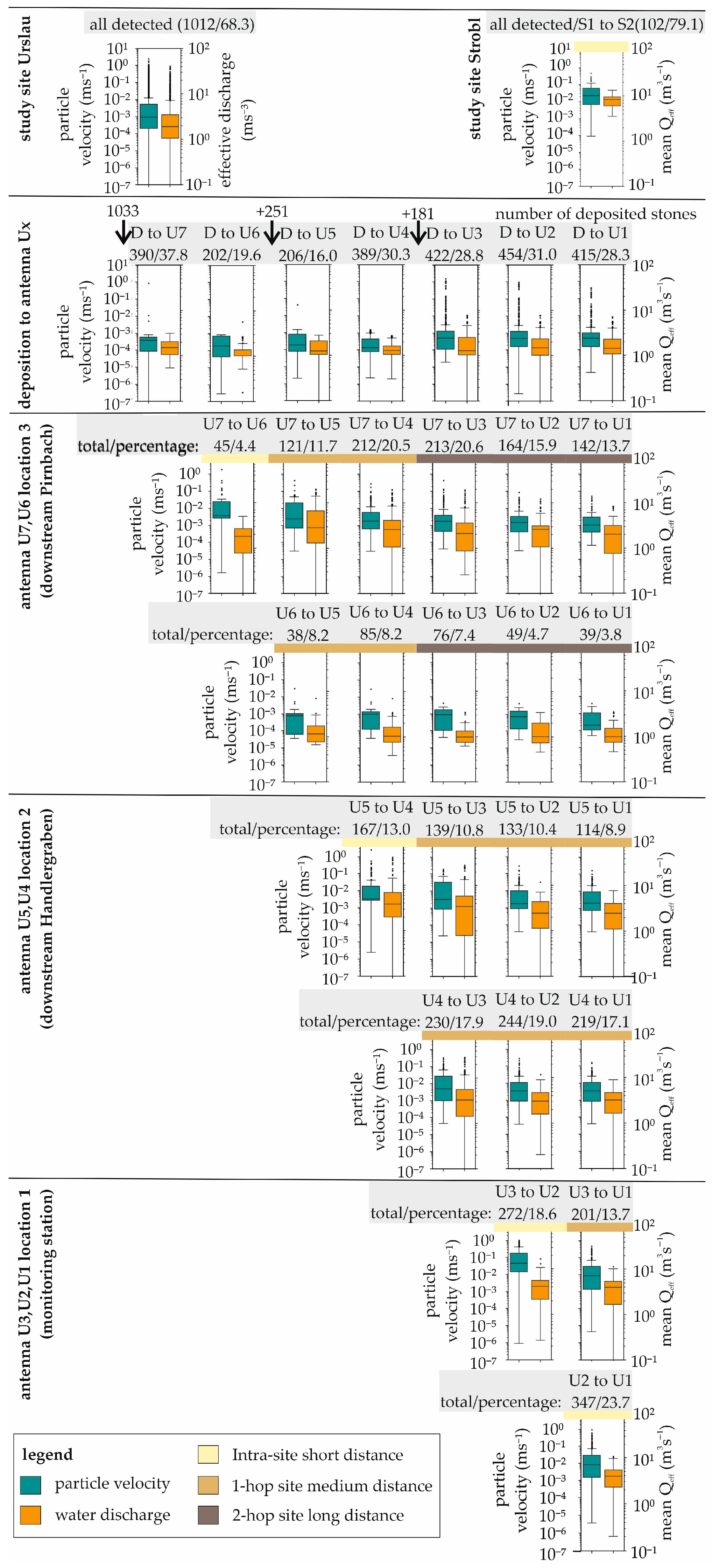 51]. This system provides continuous and long-term data on the transport processes in the stream. The additional equipment with a total of seven stationary RFID antennas at three strategically selected locations opens up extended possibilities for answering fundamental questions regarding the origin of the transported material during individual flow events, how the transport velocities depend on the intensity of such events, and the time that particles remain within the system.