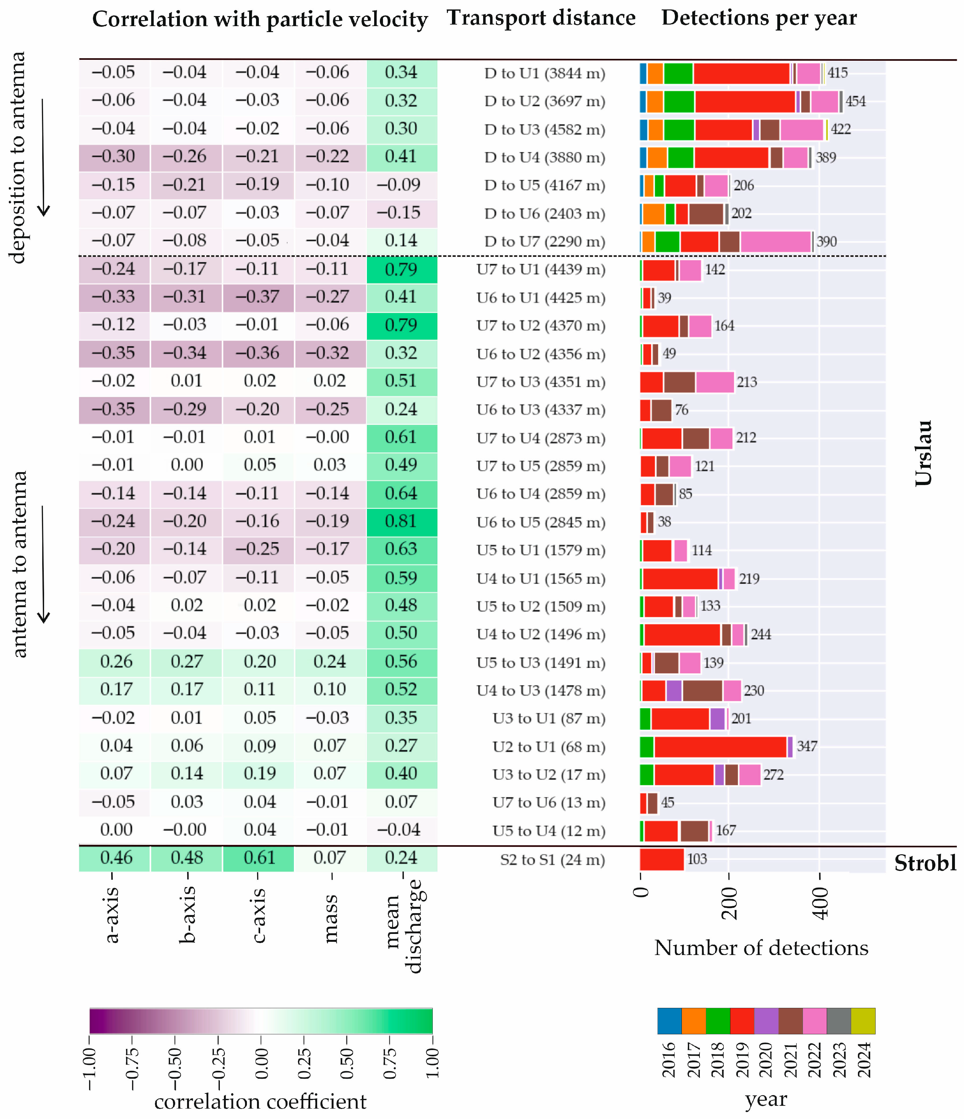 Figure 7 is divided into three sections. The first section delineates the deposition process up to the detection stage. The subsequent section expounds on the double detections that occurred between two antennas at Urslau. The final section details the double detections that took place at Strobler-Weißenbach. The various lines are arranged in descending order according to the distance between two recordings. The left side of the graph displays the correlation coefficient between the velocity of particles and the length of their axes, as well as their mass and effective discharge. The right side of the graph contains a bar chart that displays the number of double detections for each transport section, separated by year (2016–2024). The most detections occurred in 2019 and 2022.