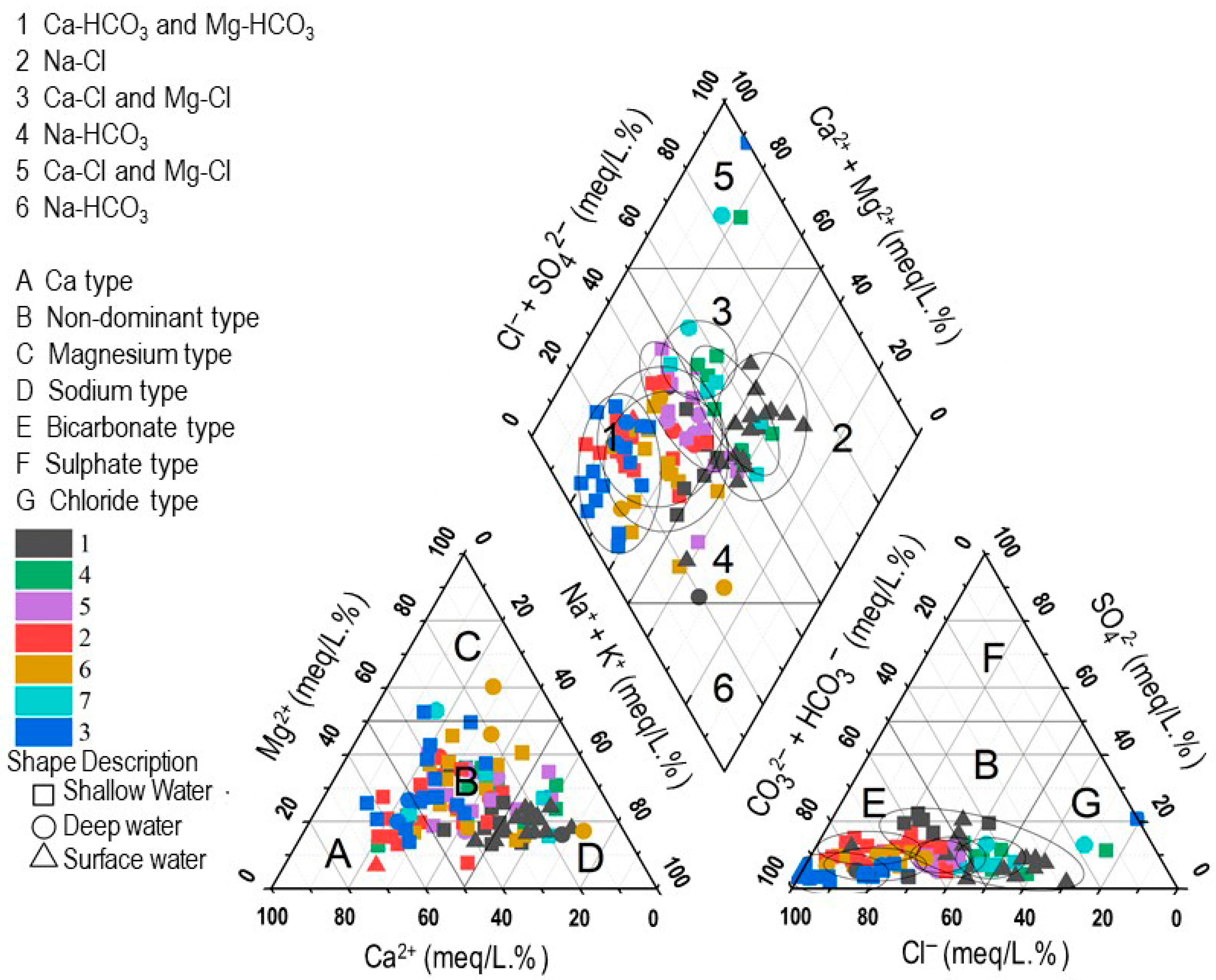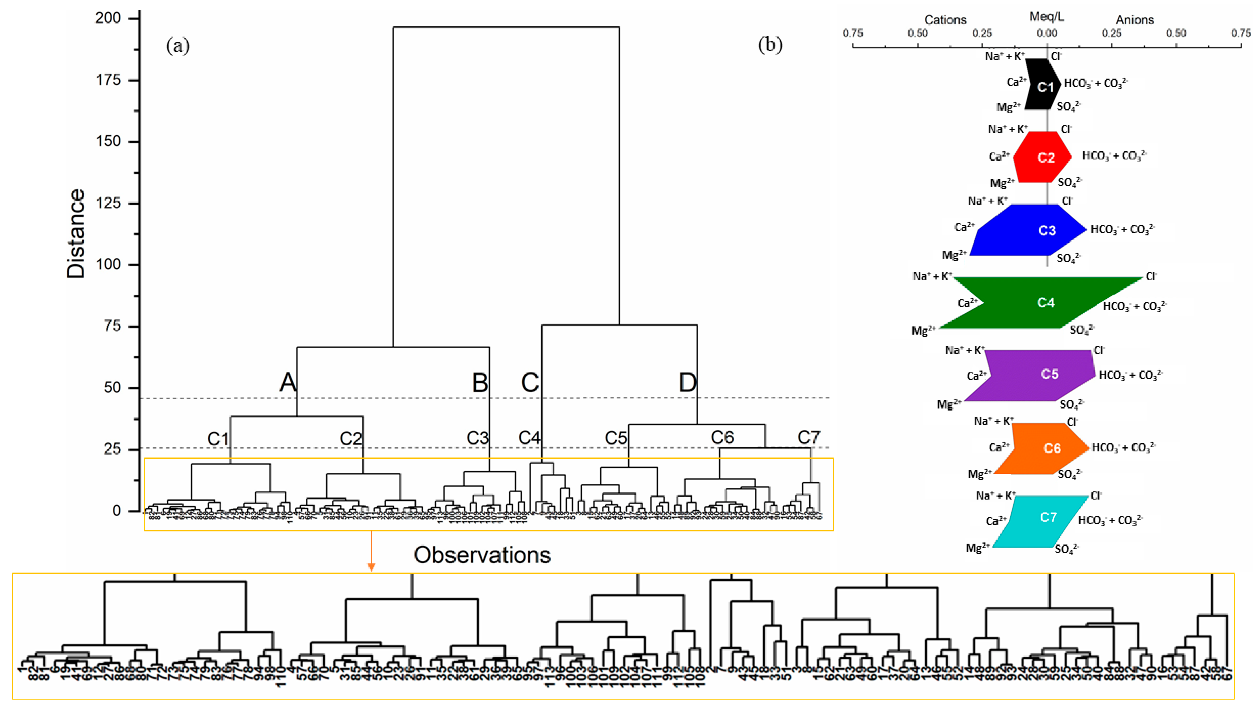 - Güler, C.; Thyne, G.D.; McCray, J.E.; Turner, A.K. Evaluation of graphical and multivariate statistical methods for classification of water chemistry data. Hydrogeol. J. 2002, 10, 455–474. [Google Scholar] [CrossRef]