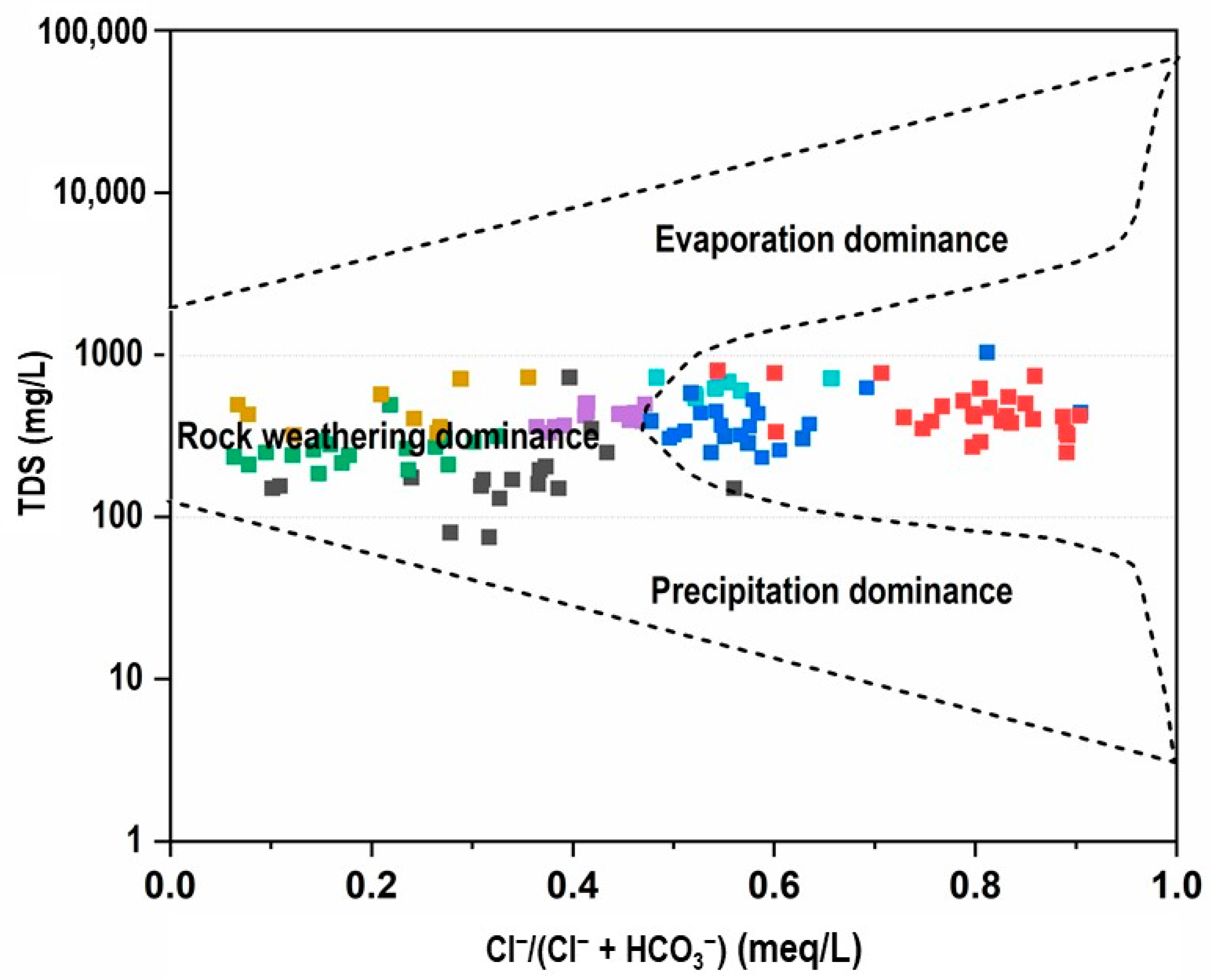 - Gibbs, R. Mechanisms Controlling World Water Chemistry. Science 1970, 170, 1088–1090. [Google Scholar] [CrossRef] [PubMed]