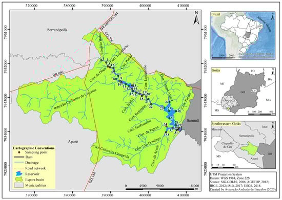 The reservoir of the Espora HPP is located in the middle third of the Corrente River, formed by the junction of the Formoso and Jacuba rivers, which originate within the Emas National Park, and has an extension of around 450 km. As a tributary of the right bank of the Paranaíba River, it forms the border between the Minas Gerais and Goiás States, forming the Paraná Sedimentary Basin. The reservoir is located downstream of the village of Itumirim, at the intersection of BR 060 and GO 184, among the municipalities of Serranópolis, Aporé and Itarumã, with the UTM-WGS84 Projection system, Sheet SE-22-YB [28,29].