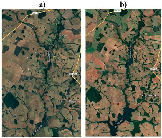 (a,b)—Spatial-temporal cutout of a Google Earth image from 2002 (a) and 2020 (b) showing the area flooded by the Espora HPP dam.
