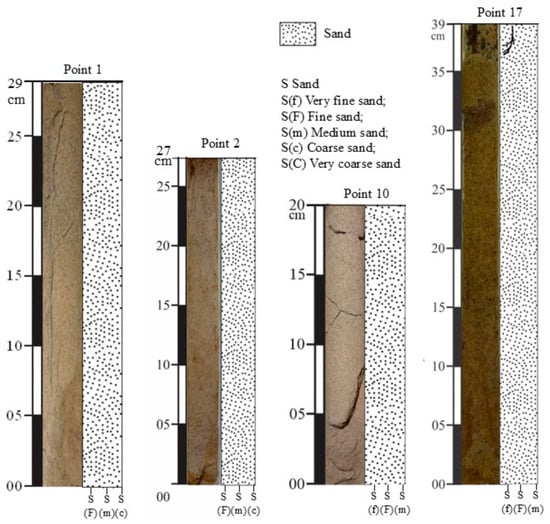 Bed deposits are composed of fine silt and clay particles, which are usually transported in suspension in the waters, especially in areas closest to the reservoir dam, in transition zones with low flow velocity. In these areas, due to the greater depth and width, there is greater settling and deposition of sediments. The material deposited in this environment is predominantly composed of clayey and silty sediments, with small layers of very fine to fine sand, which are deposited below the silt and clay layers. It is possible to observe that the profiles ranged from 0.13 to 0.28 m, with predominance of silty-clayey sand. The codes of the identified facies include: F—clay and silt, S(f)—very fine sand, and S(m)—medium sand. These sediments are influenced by the Vale do Rio do Peixe Formation, located in the areas of higher elevations of the basin, composed of sandstones with a structure of fine to very fine particles.