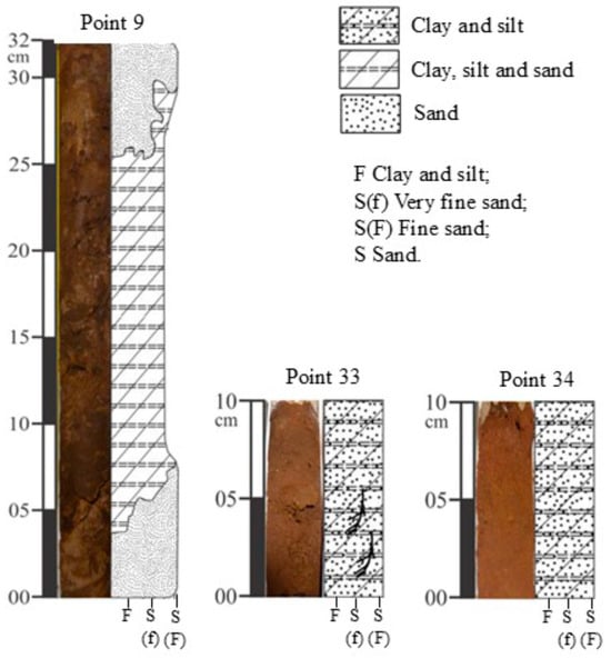 The characterization of the vertical sedimentary profiles and the analysis of the materials deposited in the cores sampled at these points indicated the predominance of silty-clayey sediments interspersed with silty-clayey sand. The particle-size variation observed in these profiles reflects the influence of different source areas, oscillations in the flow rate of tributaries, variations in rainfall levels and anthropogenic impacts on the contributing watersheds. Sediments with length of 32 cm were found in the cores of point 9, located at the mouth of the Cachoeira do Corrente stream, whose drainage area is predominantly occupied by sugarcane crops and extensive livestock farming. Points 33 and 34, both with 10 cm-long sediments, are located at the mouths of the São Domingos and Tapera creeks, respectively. These three points are under the influence of the Vale do Rio do Peixe (K2VP) and Serra Geral geological formations, with predominant soils of the Latossolo Vermelho and Latossolo Vermelho Distrófico types (Oxisols), mostly used for extensive livestock farming [13]. The sedimentary facies identified in these deposits include S(cl)—clay, S(si)—silt, S(vfs)—very fine sand and S(fs)—fine sand, being composed largely of silty-clayey material.