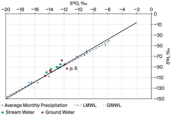 According to the isotopic analysis, the obtained data on stream water reveal variations in the δ18O values ranging from −11.1‰ to −15.6‰, and in δ2H from −86.2‰ to −99.3‰, over the observation period. The calculated d-excess values ranged from −10.3 to 13.9. To interpret the obtained results, the data obtained by isotopic analysis were plotted on the LMWL (Figure 5).