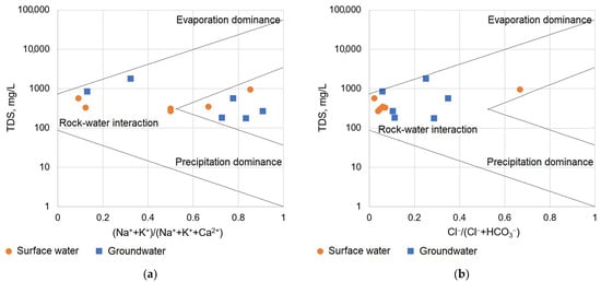 To assess the interaction between surface and groundwaters, Gibbs diagrams were additionally plotted from the cation and anion composition (Figure 9). These diagrams demonstrate the contribution by rock weathering processes to water formation and simultaneously show an increased proportion of Cl−, SO42−, and Na++K+ ions in groundwaters, indicating possible surface water infiltration into the underground aquifer. Gibbs diagrams for cations and anions show that neither surface nor ground waters are concentrated within a single dominant area (precipitation, rock weathering, or evaporation). The data points are distributed in the transition zone between precipitation and water-rock interaction areas, without being significantly shifted toward the evaporation area.