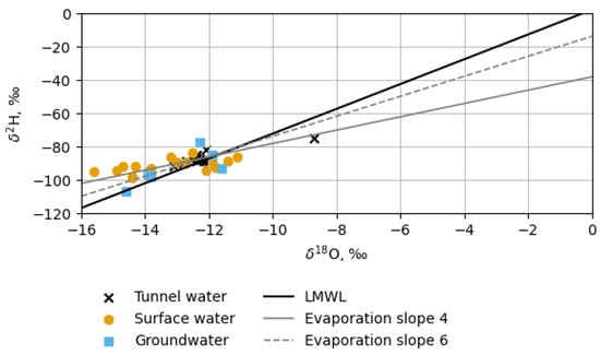 As shown in Figure 10, the data for tunnel water, surface and groundwater do not lie on these evaporation lines. This proves that no significant evaporation occurred during their formation. The exception is tunnel 504, whose δ2H and δ18O values are shifted toward “heavier” values, consistent with the observed negative d-excess (Figure 4b).