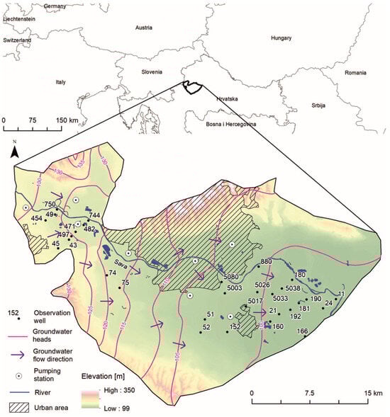The aquifer system consists of Quaternary sediments with a thickness that varies from approximately 10 m in the extreme west to 100 m in the east [29,30]. The hydraulic conductivity reaches up to 3600 m/d close to the Sava River. Towards the edges of the Sava valley, the aquifer hydraulic conductivity decreases. The semipermeable layer overlying the aquifer, which protects the groundwater, gradually increases in thickness from the river toward the edge of the alluvium, reaching about 4–6 m.