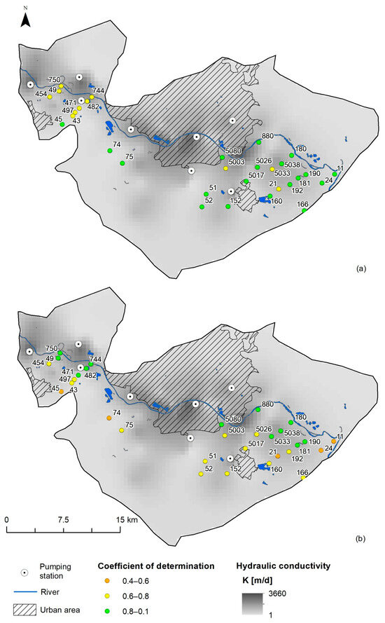 Furthermore, in this study, SVR simulations were conducted using monthly groundwater levels, Sava River levels, and precipitation as input variables. Despite the heterogeneity of the aquifer (Figure 4 and Figure 5), a relatively good agreement between the observed and simulated groundwater levels (GWLs) was found for most of the analyzed observation wells (Table 3). The results demonstrated that the applied SVR model provides a relatively accurate GWL forecast, performing comparably to more advanced ML and DL models, as shown in the studies by Zarafshan et al. [17], Yeganeha et al. [18], and Igwebuike et al. [16]. However, when forecasting abrupt GWL fluctuations under, e.g., pronounced climate change conditions, models trained on daily data performed significantly better using advanced DL algorithms such as LSTM and XGBoost [43]. Thus, future research should focus on GWL forecasting at finer time scales where additional variables will need to be considered, as well as on exploring novel modeling approaches that can enhance predictive accuracy. Such advancements will contribute to more effective water resource management and better adaptation strategies for climate change.