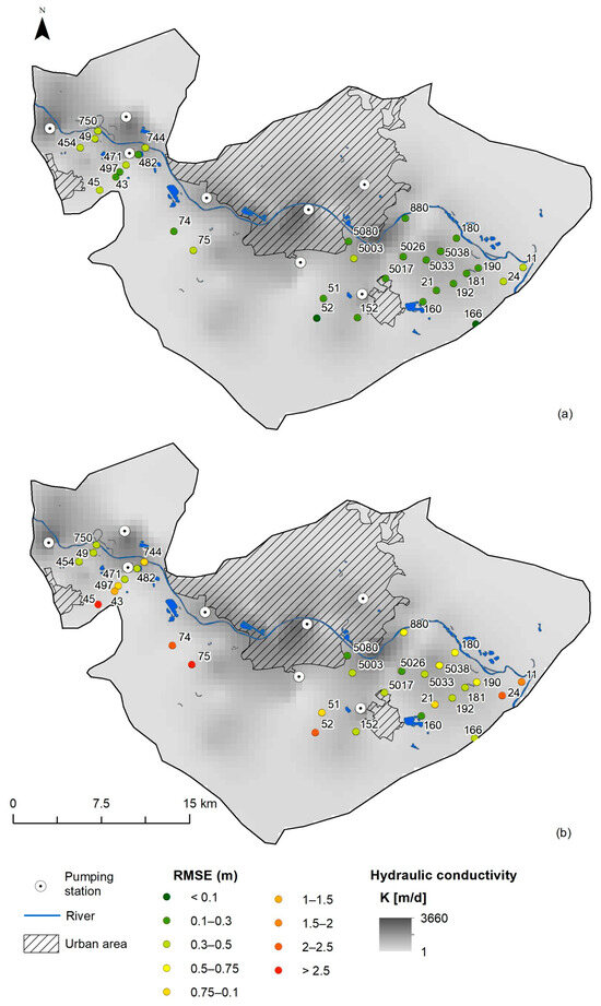 Comparing the results of the numerical model of groundwater flow in the Zagreb aquifer [29] and the SVR model described here, it was observed that the performance indicators are better for the SVR model than the NM (Table 3, Figure 4 and Figure 5). The mean R2 value for the NM was 0.74, and the mean RMSE and MAE values were 0.88 m and 0.80 m, respectively. This means that the mean R2 in the SVR model (learning dataset) was approximately 10% better than in NM, and the mean RMSE and MAE were approximately 3 and 4 times lower than in NM, respectively. Similar conclusions were reached by Chen et al. [40] and Goodarzi et al. [37]. In their study, the RMSE and R2 values demonstrated that the ML models, and especially the SVM model, achieved higher accuracy than NM.