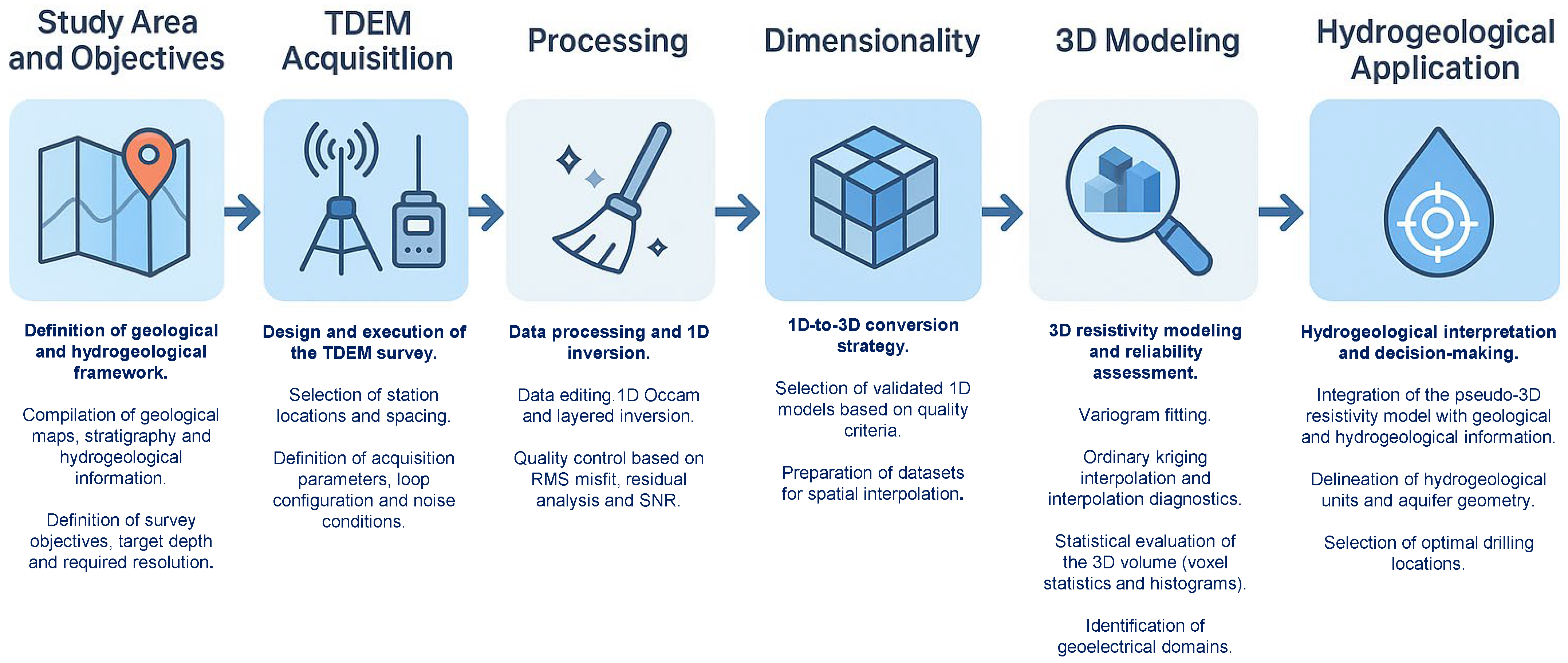 Although TDEM data have been incorporated into three-dimensional workflows in numerous hydrogeophysical and exploration studies, many practical surveys, particularly those with limited station density, still rely predominantly on independent 1D inversions and qualitative cross-sections. In such contexts, constructing a pseudo-3D resistivity volume by spatially interpolating validated 1D inversion results can provide a useful first-order representation of lateral trends and support decision-making for groundwater exploration. However, this approach does not replace a true 3D inversion, as lateral constraints are not solved within the inversion and complex geology may require fully 3D/2D constrained inversion strategies. The contribution of this study is therefore to present and evaluate a transparent 1D-to-pseudo-3D geomatic workflow, including explicit quality control of the 1D results and reliability diagnostics of the kriging-based volumetric representation, aimed at operational groundwater targeting in heterogeneous sedimentary settings.