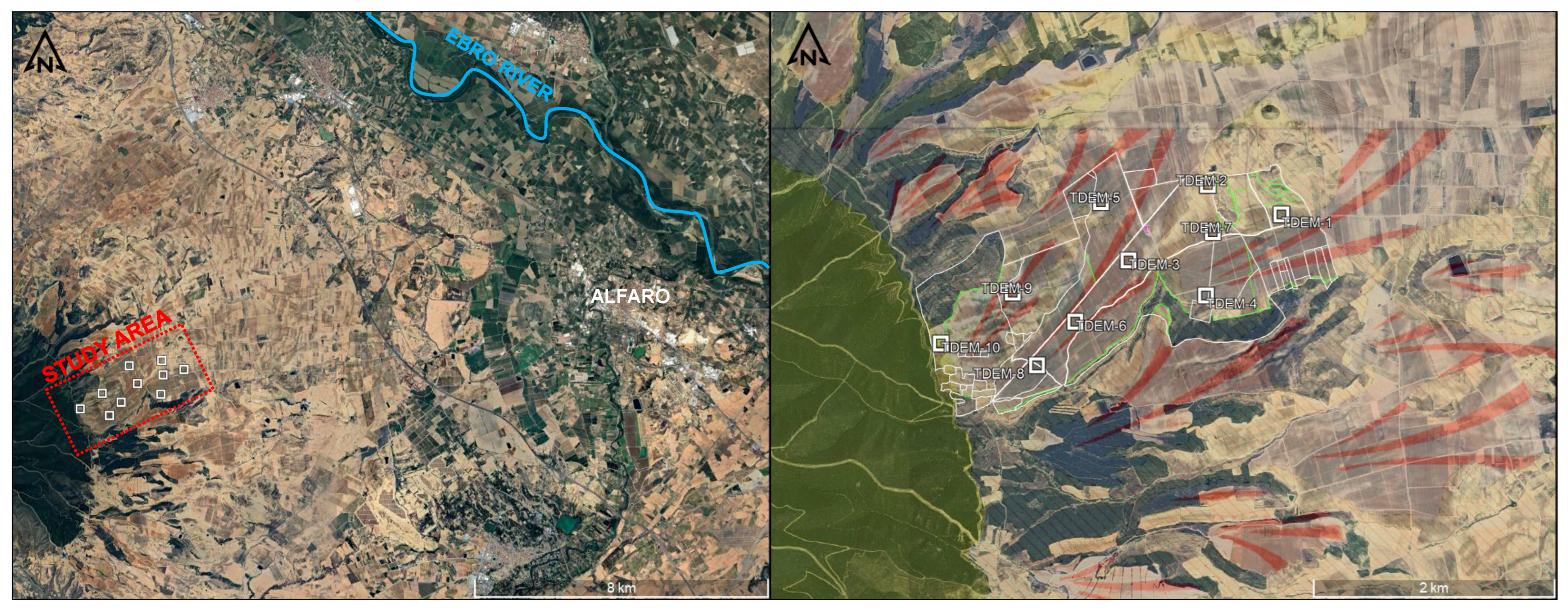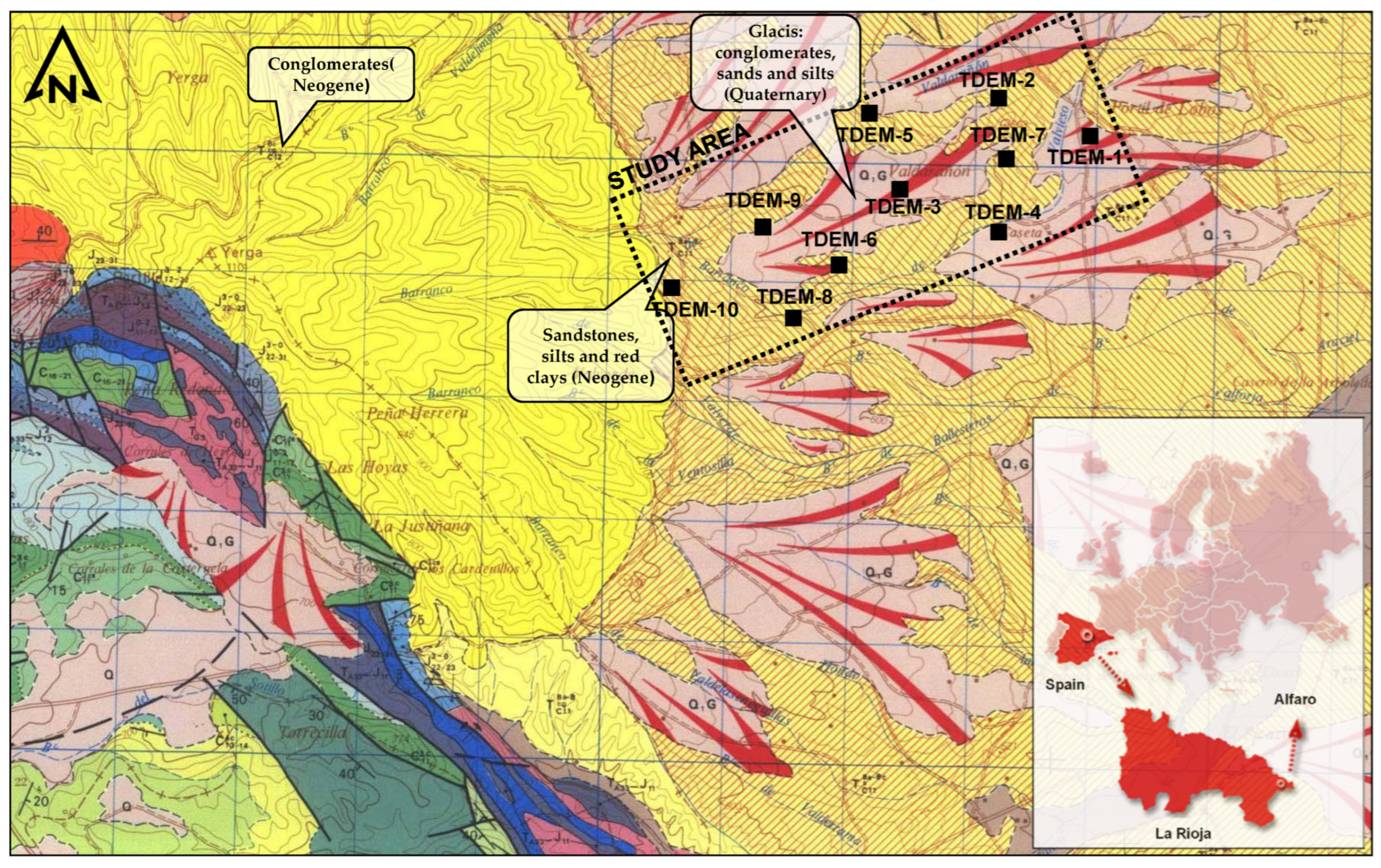The Alfaro area, in the eastern sector of La Rioja, lies within the Ebro Basin and presents a thick package of Tertiary materials, mainly clays, marls, and silts, with interbedded sandstones and conglomerates. This stratigraphy constitutes an ideal environment to evaluate the performance of TDEM and to assess the extent to which 3D modeling can help optimize the selection of drilling points.