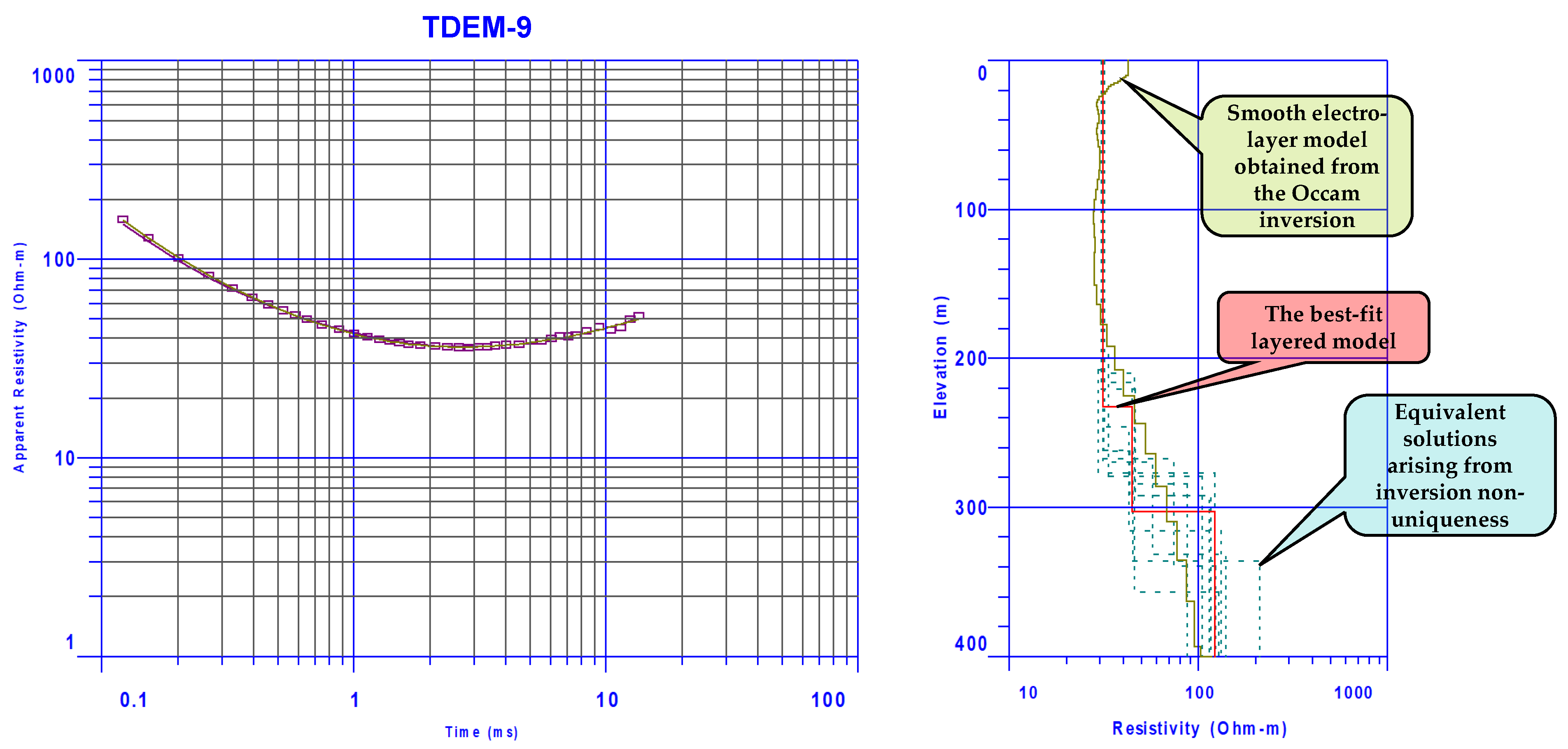 Figure 5). The Occam inversion algorithm implemented in IX1D 3.44 was used to obtain the smoothest model compatible with the measured transients, avoiding unjustified oscillations. Occam’s inversion was preferred because it provides stable results for TDEM datasets with moderate station density and variable noise levels, producing the smoothest conductivity model consistent with the measured transients. In contrast, Marquardt or damped least-squares approaches tend to generate models with stronger layer-to-layer contrasts, which can lead to instability or overfitting when late-time uncertainties are significant. Smoothness-constrained least-squares methods also require careful tuning of regularization parameters, whereas Occam’s formulation determines the smoothest acceptable model automatically, reducing subjectivity in parameter selection. However, Occam’s method has limitations: the resulting models may oversmooth sharp geological boundaries and suppress localized resistive or conductive bodies. For this reason, complementary layered models were also generated to evaluate non-uniqueness and better understand potential sharp contrasts.
