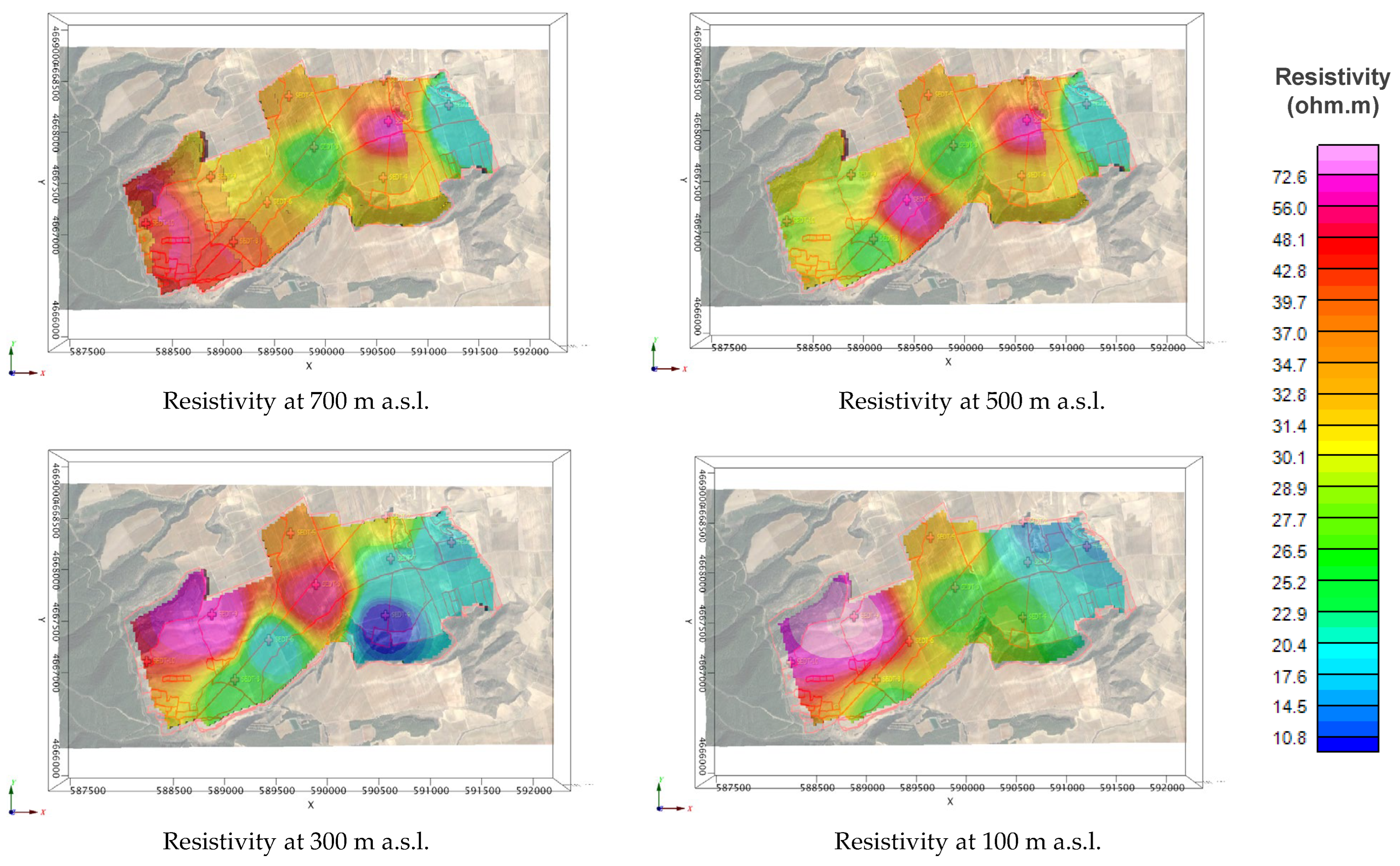 Horizontal slices at different elevations (700, 500, 300, 100 m a.s.l.) revealed a W–E lateral gradient toward lower resistivities (