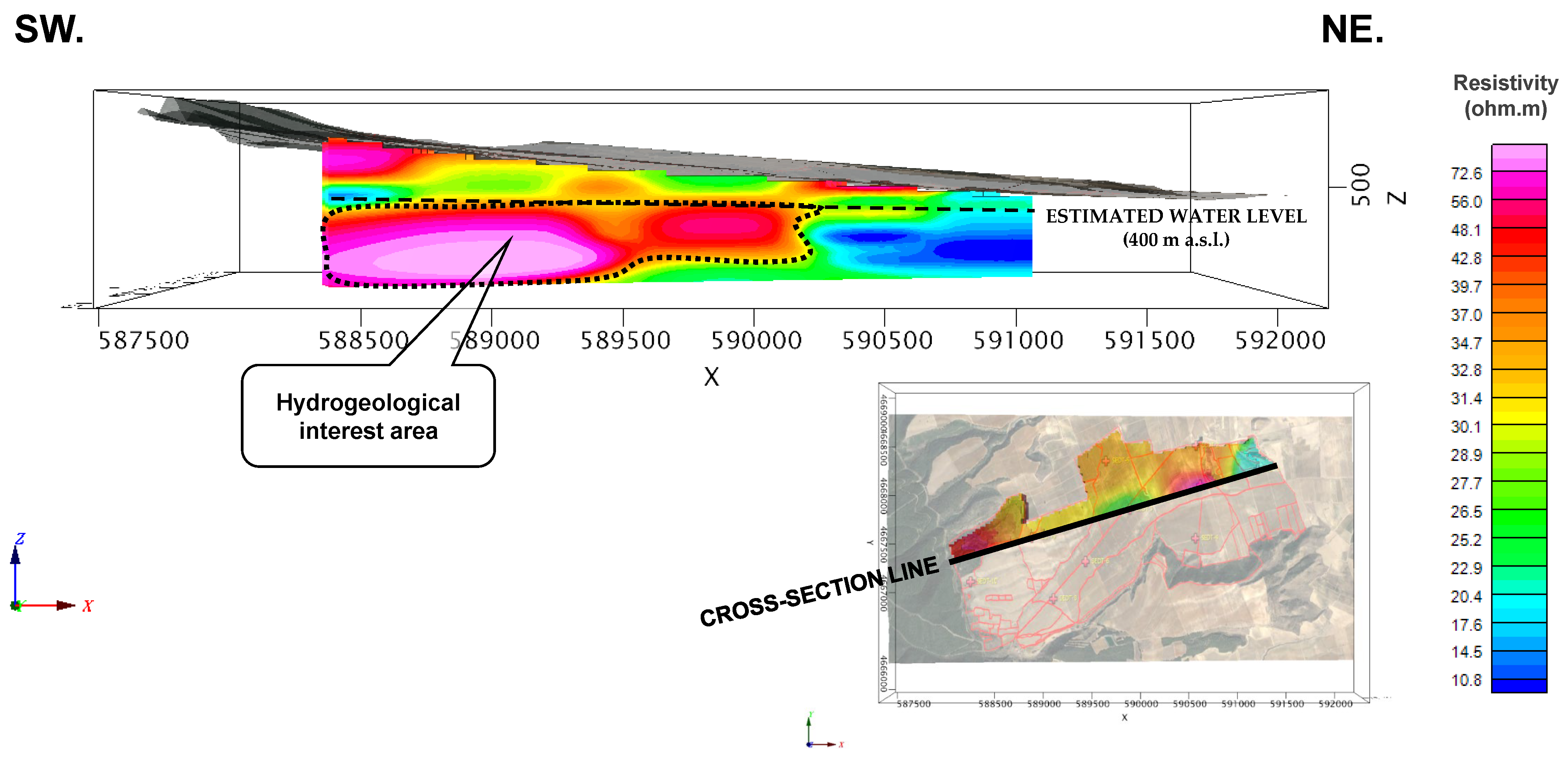 Although the resistivity domains have been hydrogeologically interpreted, the study area currently lacks borehole or pumping-test data that would allow a direct validation of these interpretations. Future work will incorporate lithological and hydraulic information as soon as it becomes available, which will enable a more robust calibration of the geophysical model.