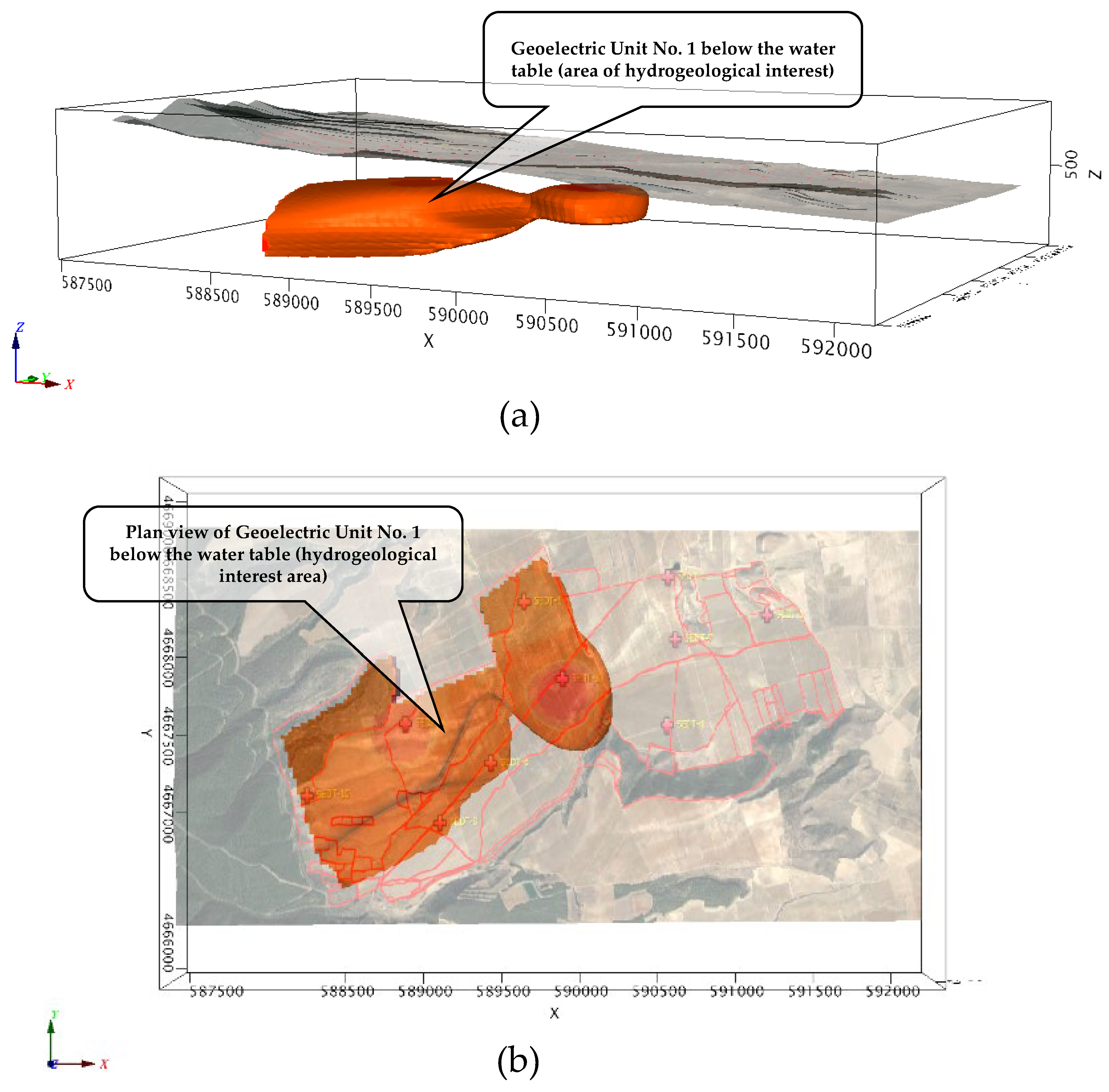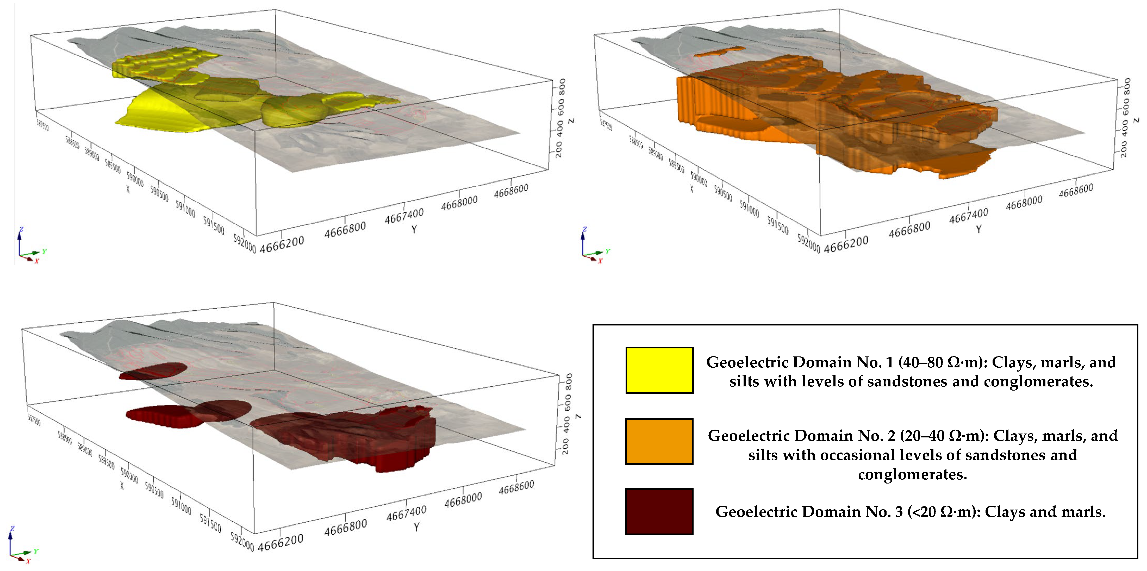Figure 12). Volumetric analysis identified that Geoelectrical Domain No. 1 (40–80 ohm·m) presents: