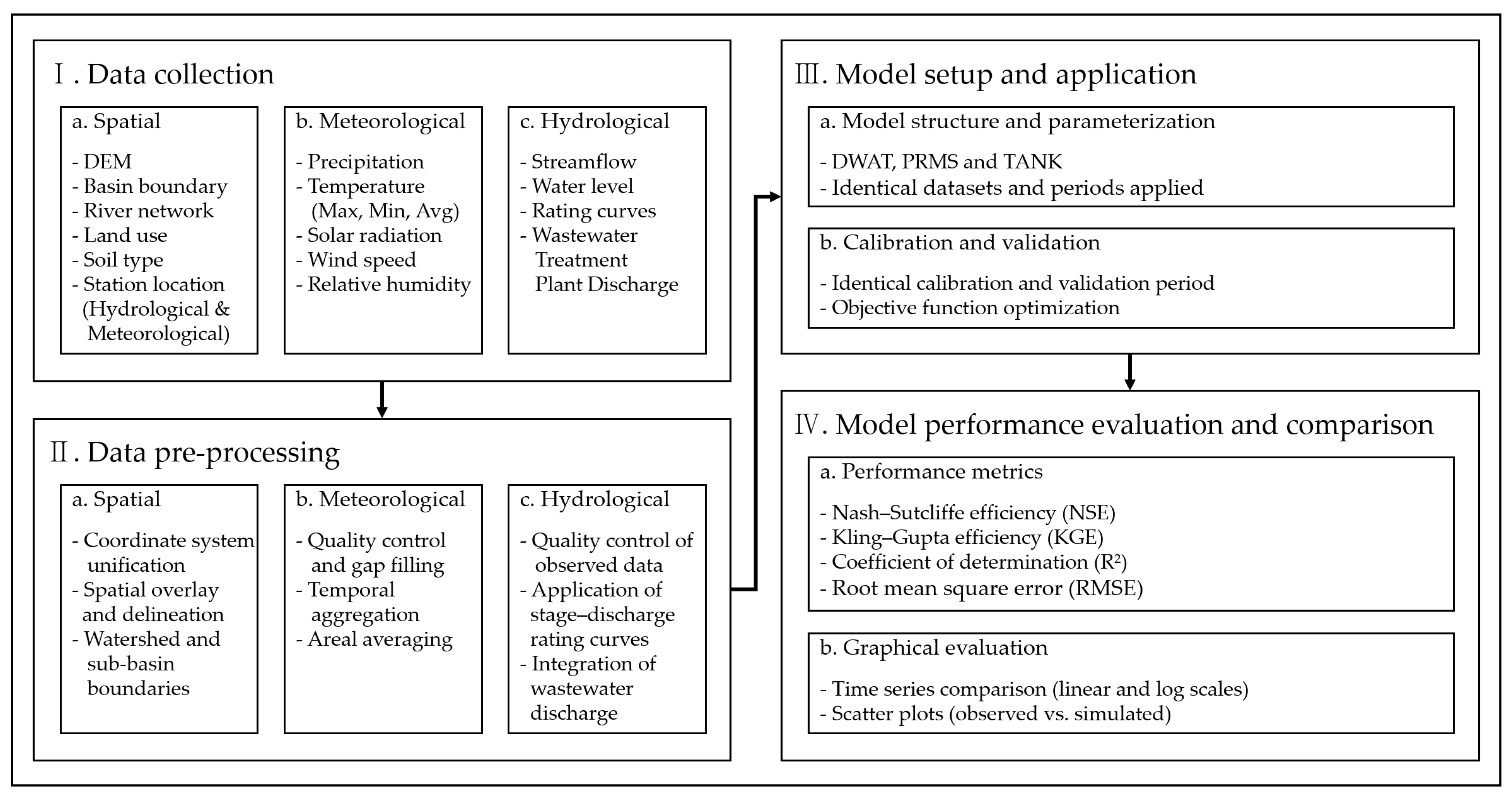 To ensure a fair and consistent comparison among the three hydrological models (DWAT, PRMS, and TANK), a unified methodological framework was established in this study. Identical spatial, meteorological, and hydrological datasets were applied to all models, and the same simulation periods were used throughout data preprocessing, model setup, calibration, validation, and performance evaluation. Specifically, the 12-year simulation period was strictly divided into a calibration period (2012–2019) and an independent validation period (2020–2023) for all three models. Model calibration and validation were conducted using identical time periods and objective functions to minimize potential bias arising from differences in calibration intensity or data availability. The overall workflow of the study, including data collection, preprocessing, model application, calibration and validation, and performance evaluation, is summarized in