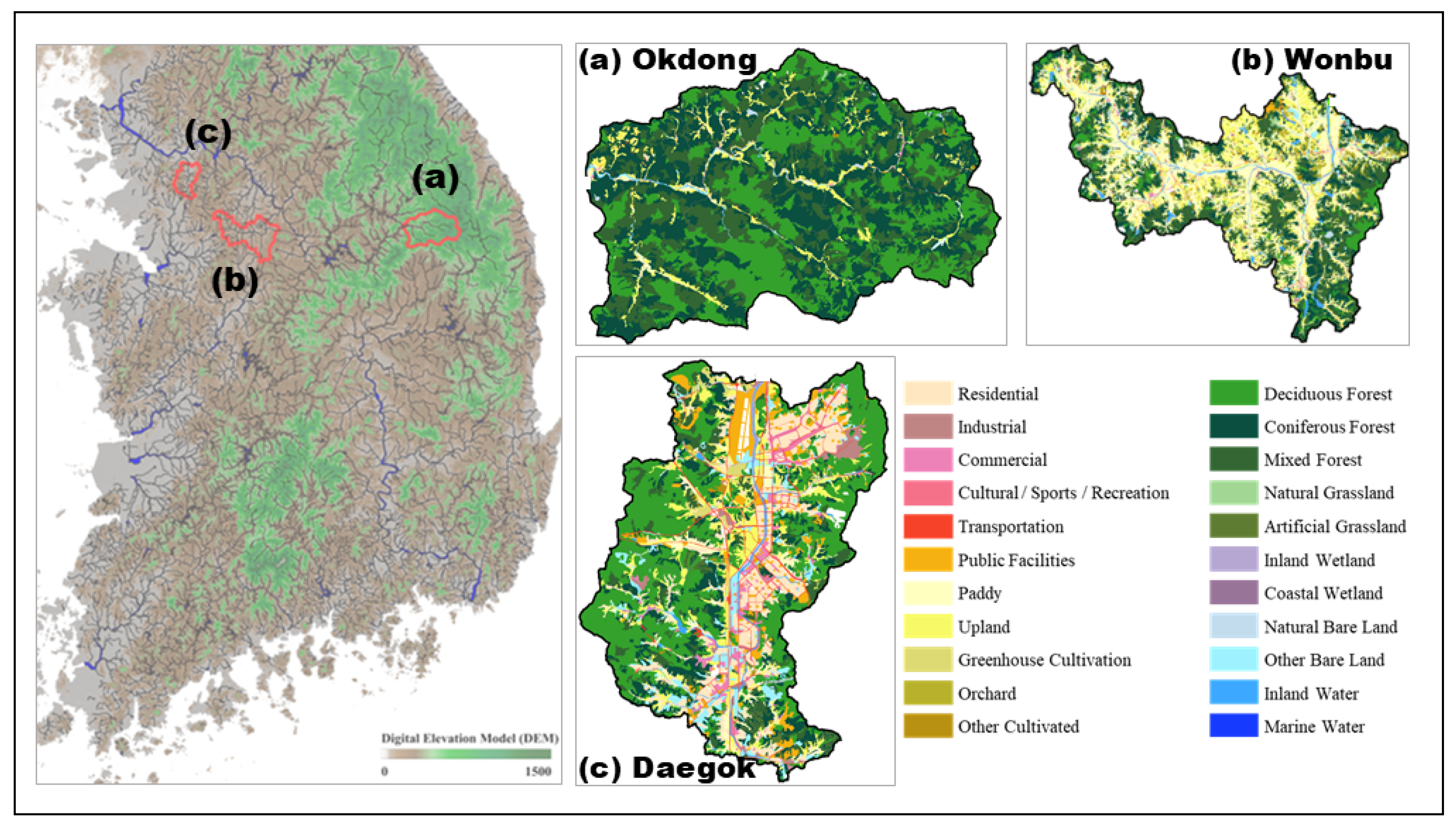 This study was conducted in a watershed encompassing three gauging stations in the Republic of Korea: Okdong-gyo in Yeongwol-gun, Gangwon Province; Wonbu-gyo in Yeoju-si; and Daegok-gyo in Seoul Metropolitan City. Each watershed was selected to represent distinct topographic and land-use characteristics, namely mountainous, mixed, and urban types. The Okdong-gyo watershed is a typical mountain stream, characterized by steep slopes and a high proportion of forest cover. Approximately 93.2% of the watershed area is covered by forest, resulting in high infiltration rates and relatively low surface runoff under normal rainfall conditions (