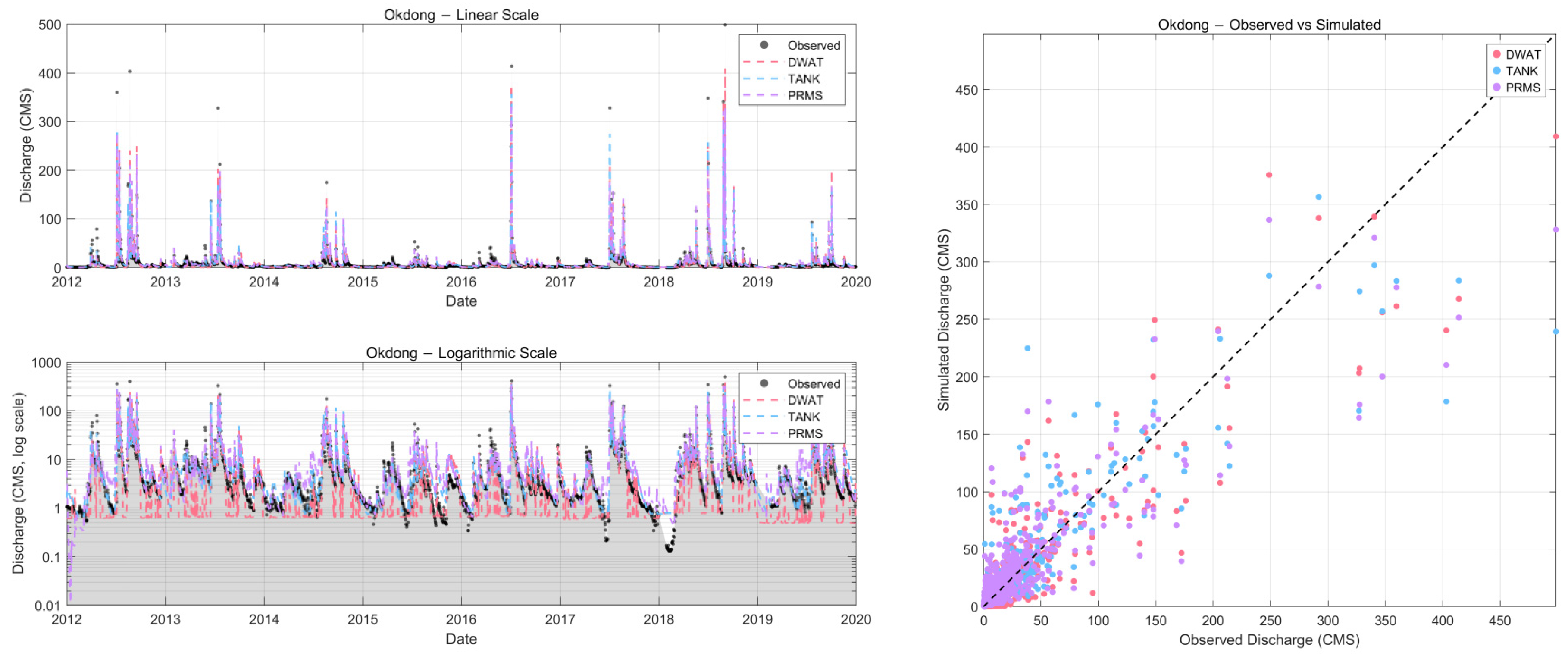 Table 7), DWAT and TANK showed comparable logRMSE values, indicating similar capability in reproducing low-flow variability; however, both models tended to underestimate low flows, as reflected by negative PBIAS values. In contrast, PRMS exhibited substantially larger errors and stronger negative bias, suggesting limited applicability under low-flow conditions. In the Okdong basin (