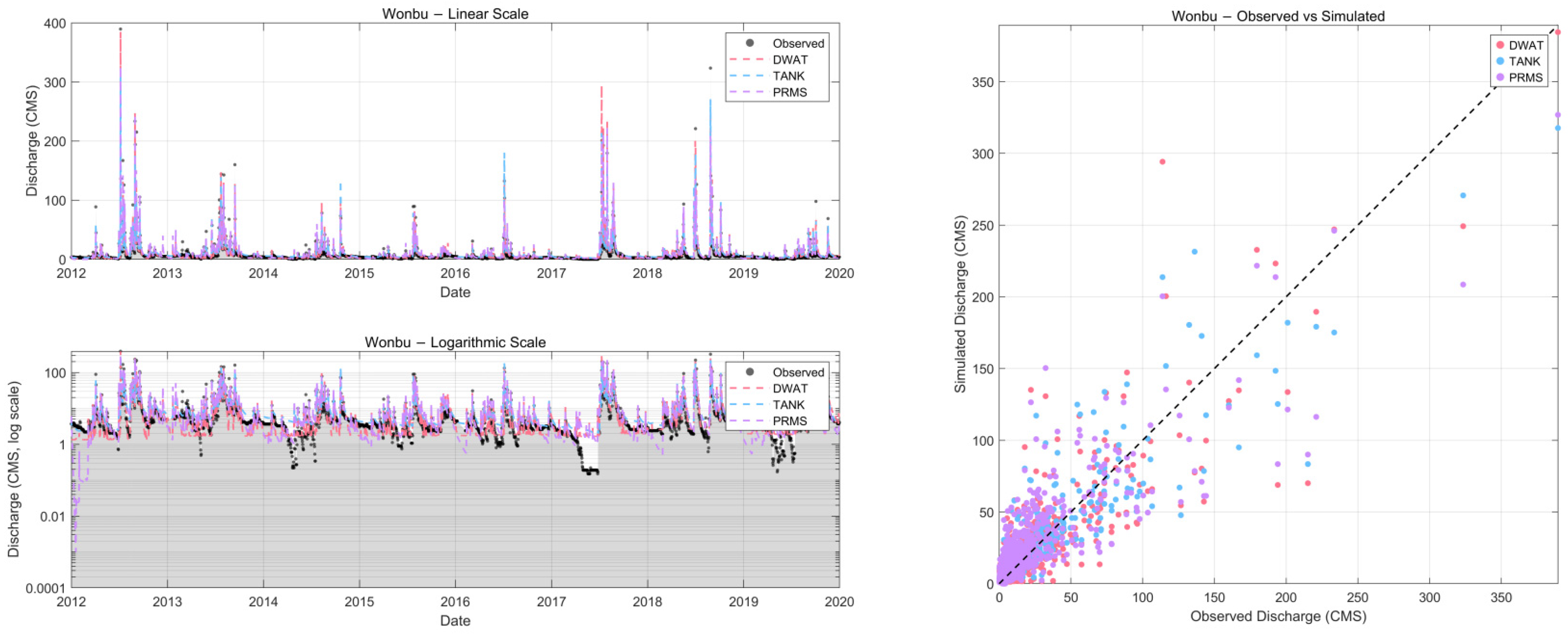 Table 8), the TANK model achieved the lowest logRMSE, demonstrating superior representation of low-flow variability, while DWAT showed smaller bias magnitude, indicating better reproduction of low-flow volumes. PRMS consistently overestimated low flows and exhibited higher error levels. For the Wonbu basin (