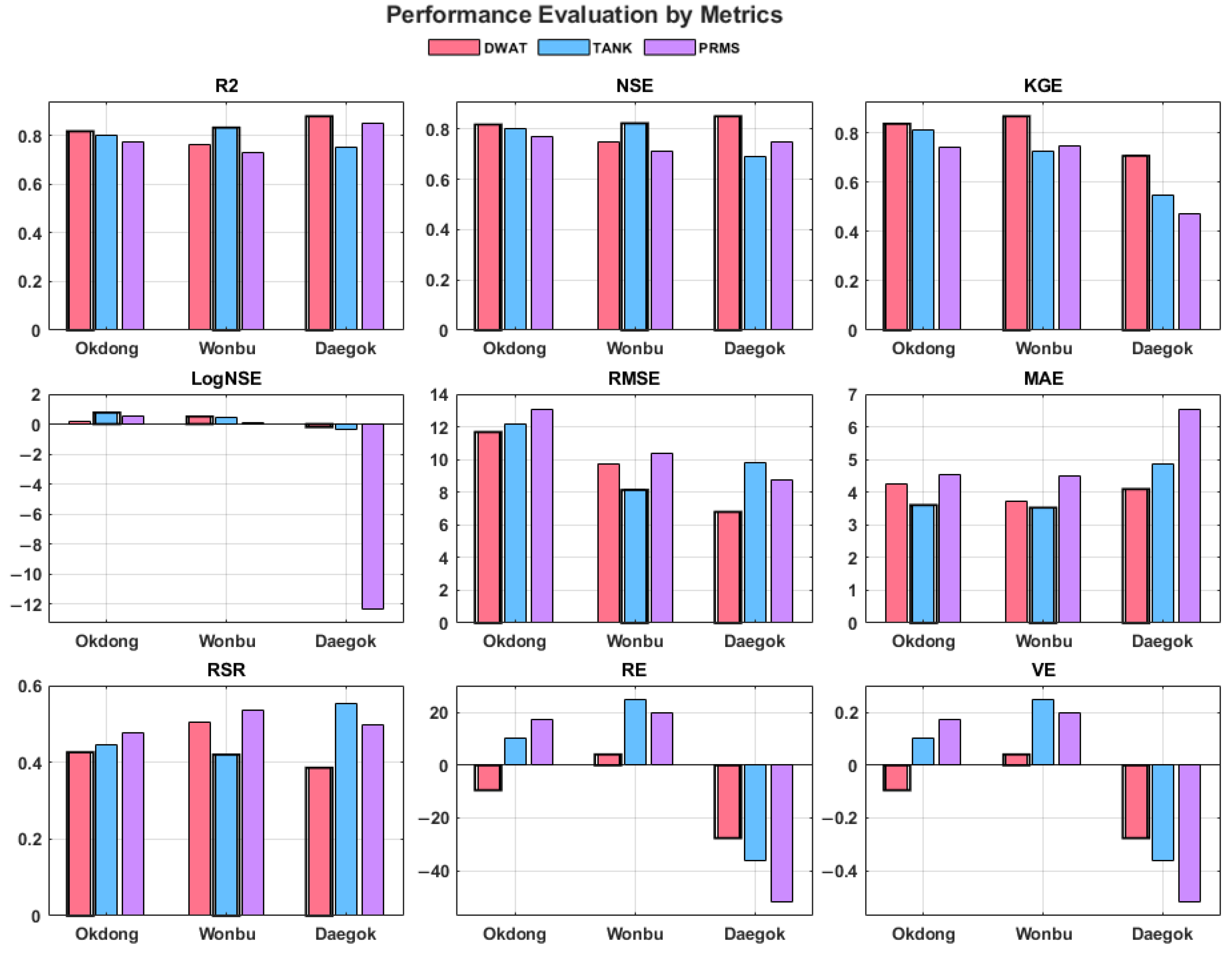 Figure 6, the black frames highlight the best-performing model for each evaluation metric at each site. At Okdong-gyo, DWAT and TANK showed similar R