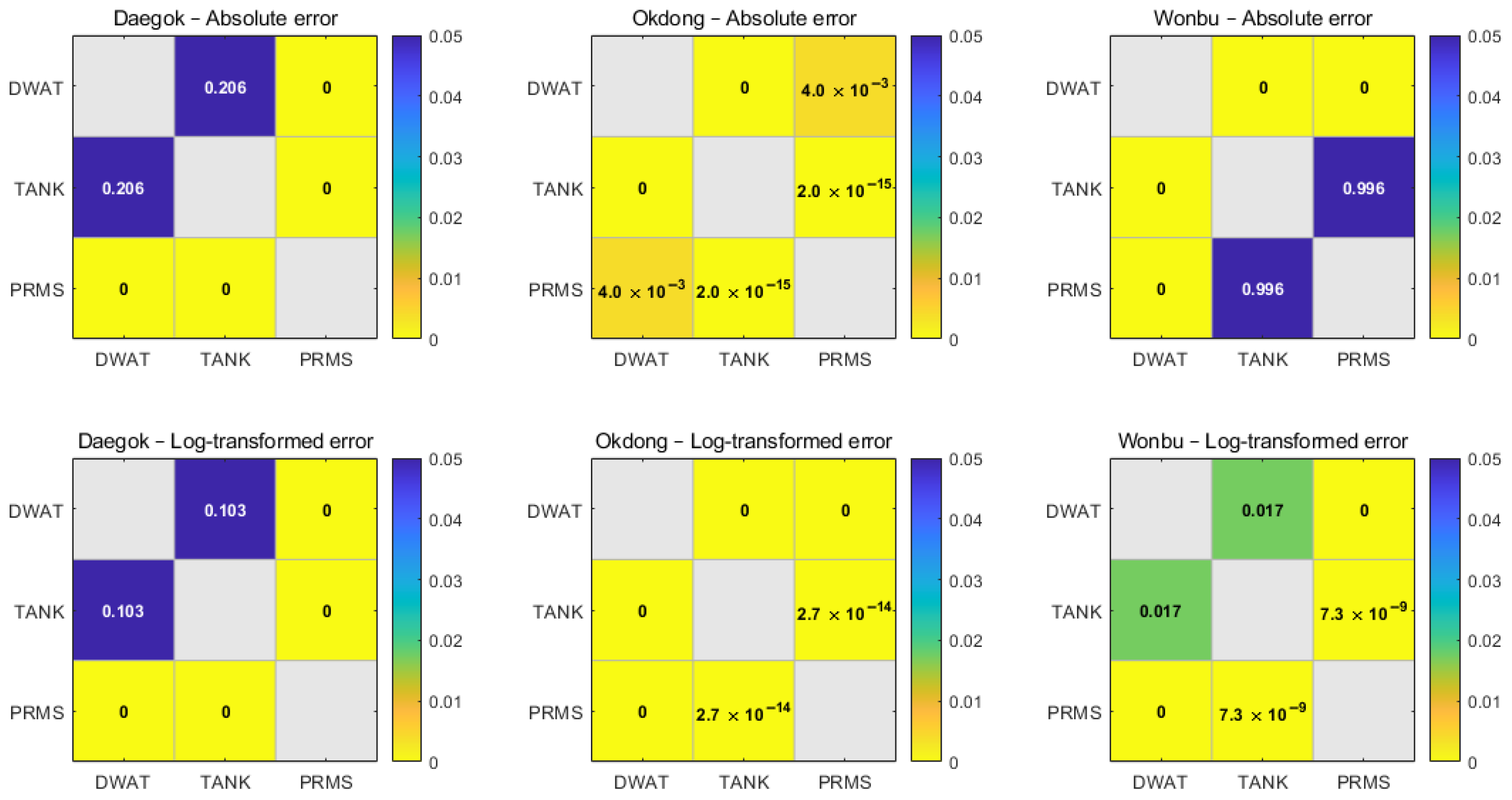 p-values. Differences between DWAT and TANK, however, show distinct basin-dependent patterns, with non-significant results observed in the Daegok basin and significant differences emerging in the Okdong and Wonbu basins. This visual comparison reinforces the conclusions drawn from