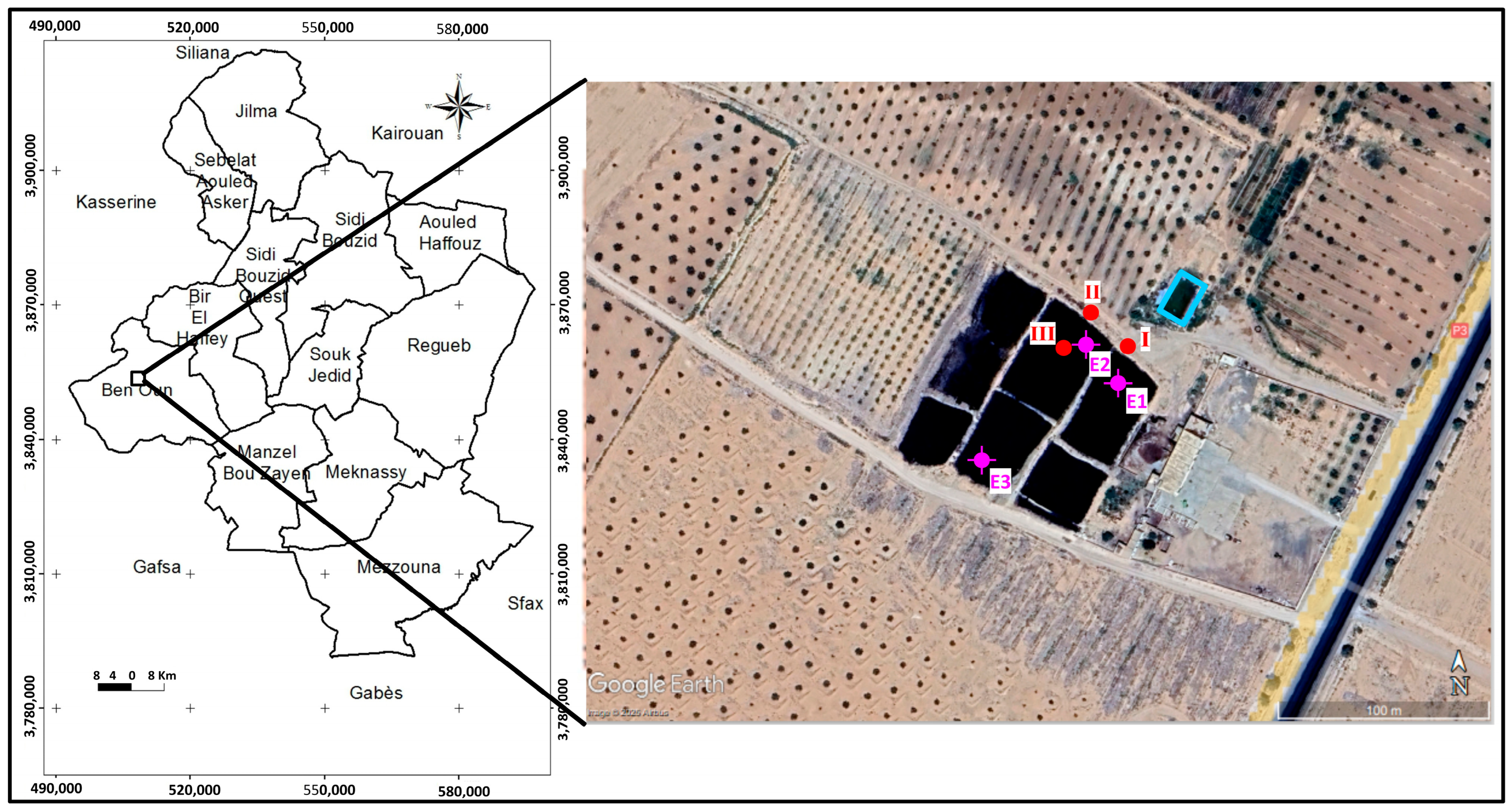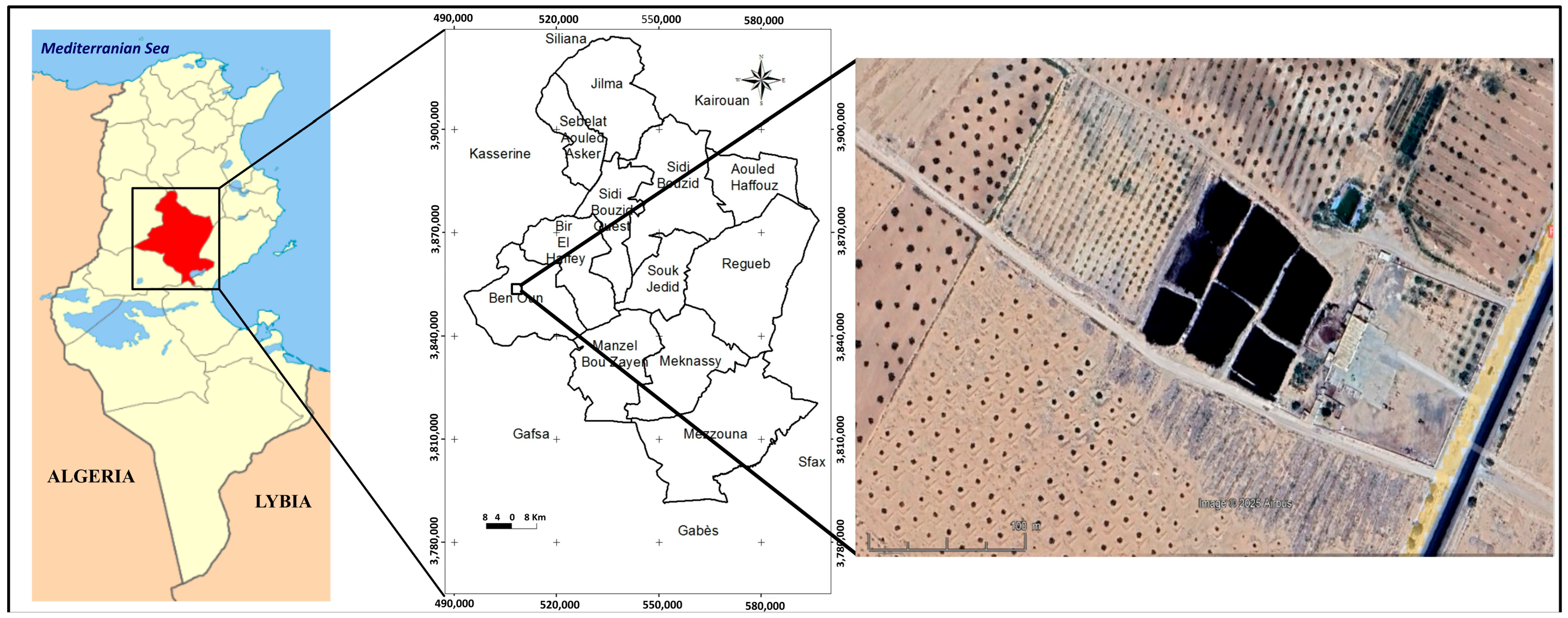 - Loukil, E.; Gargouri, K.; Ben Mbarek, H.; Soua, N.; Ouhibi, T.; Gargouri, N.K.; Rigane, H. Application of electrical resistivity tomography method for the assessment of olive mill wastewater infiltration in storage basin site (southeastern Tunisia). Arab. J. Geosci. 2021, 14, 1215. [Google Scholar] [CrossRef]