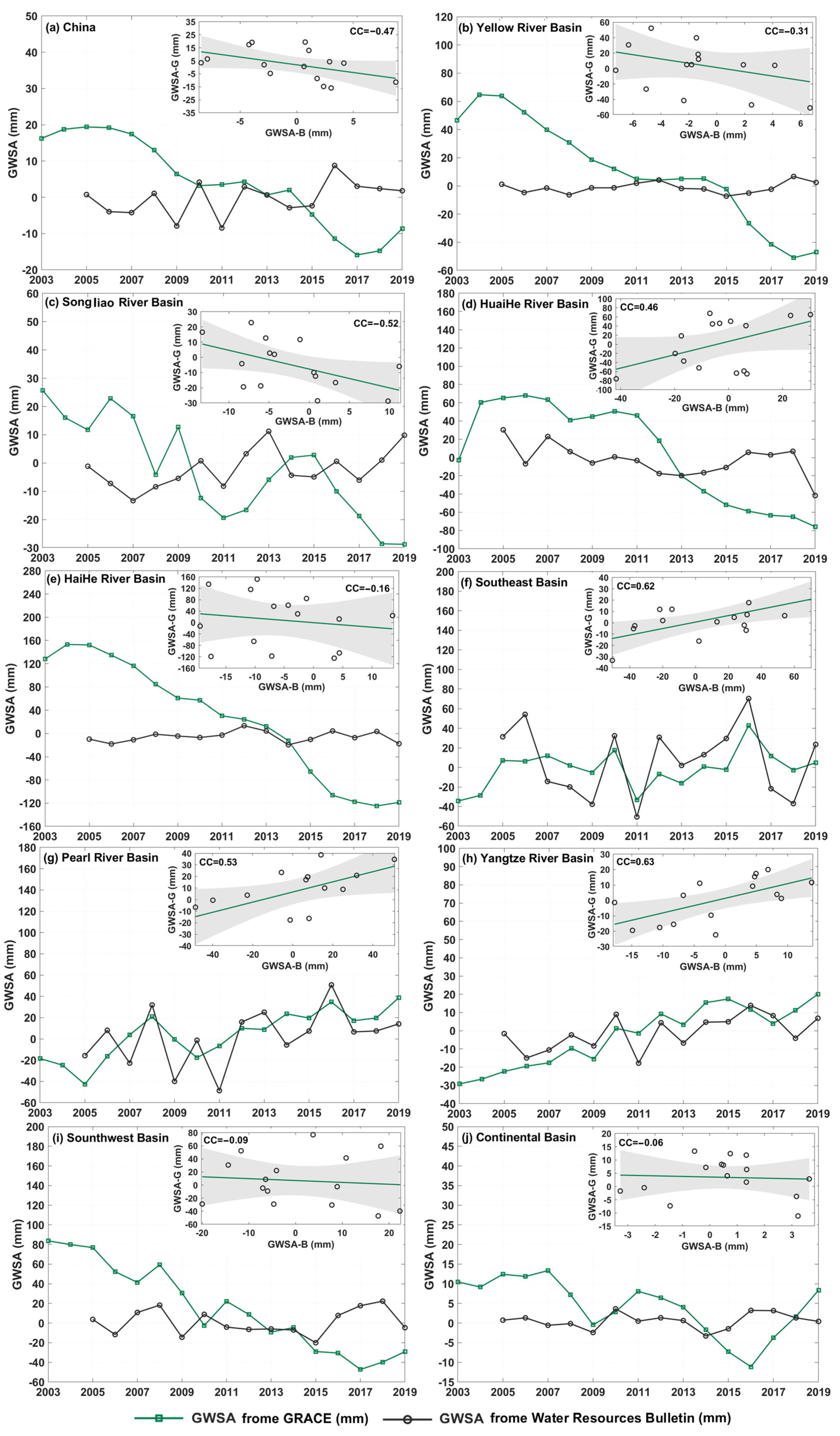 3.1. Comparison of GRACE-Derived GWSA with Water Resources Bulletin Data